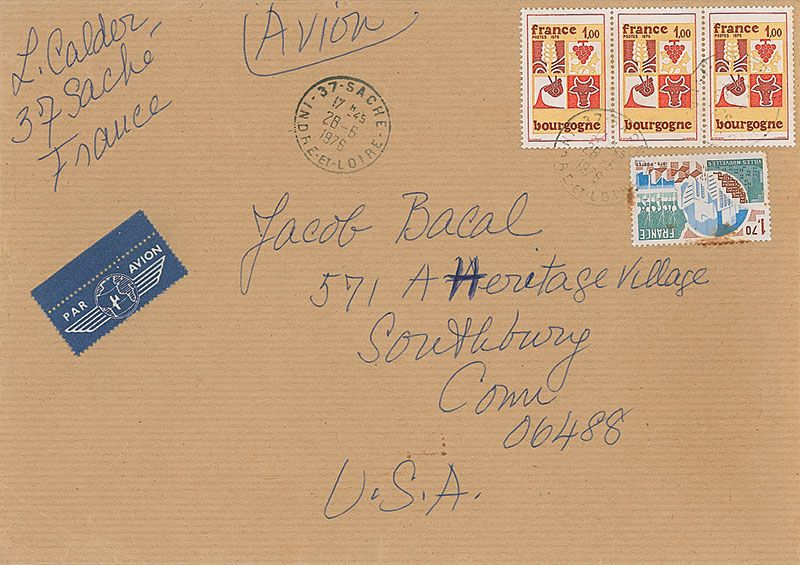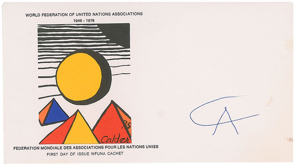 Calder-designed commemorative cover with a cachet honoring the World Federation of United Nations Associations, signed in blue ballpoint, “AC.” In fine condition, with trivial soiling to the right side. Accompanied by the original mailing envelope.