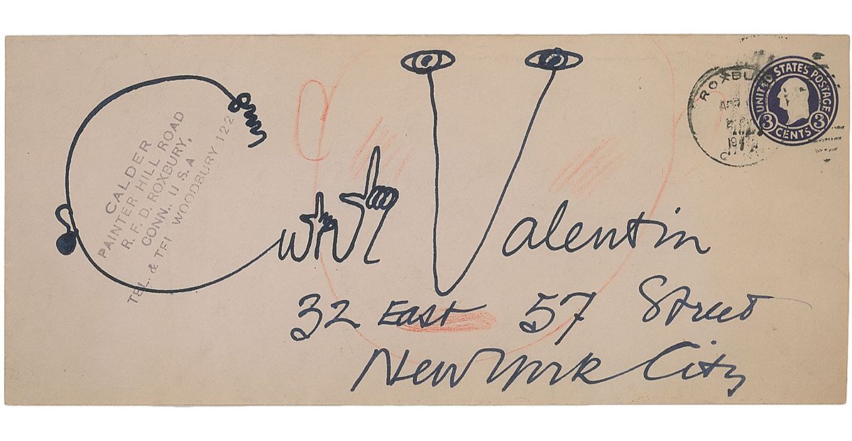 Unique hand-addressed mailing envelope, 10 x 4.5, artistically addressed in black felt tip in Calder’s hand to “Curt Valentin, 32 East 57 Street, New York City.” Calder cleverly incorporated a face and hands into the letters of the first name, eyes and a nose into the first letter of the last name, and a light sketch in red pencil to create an image of a full face. Envelope is indistinctly postmarked Roxbury, Connecticut, during the 1940s. In fine condition.
