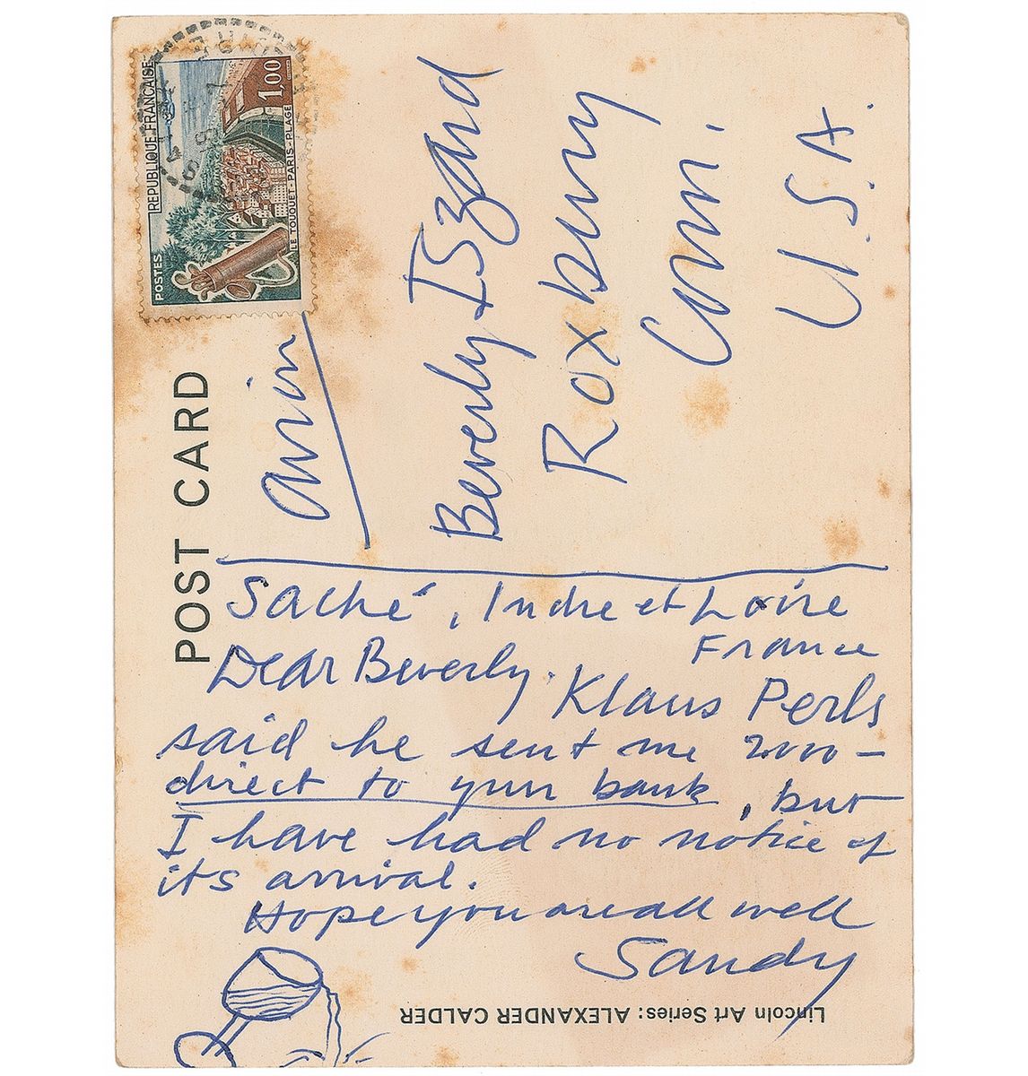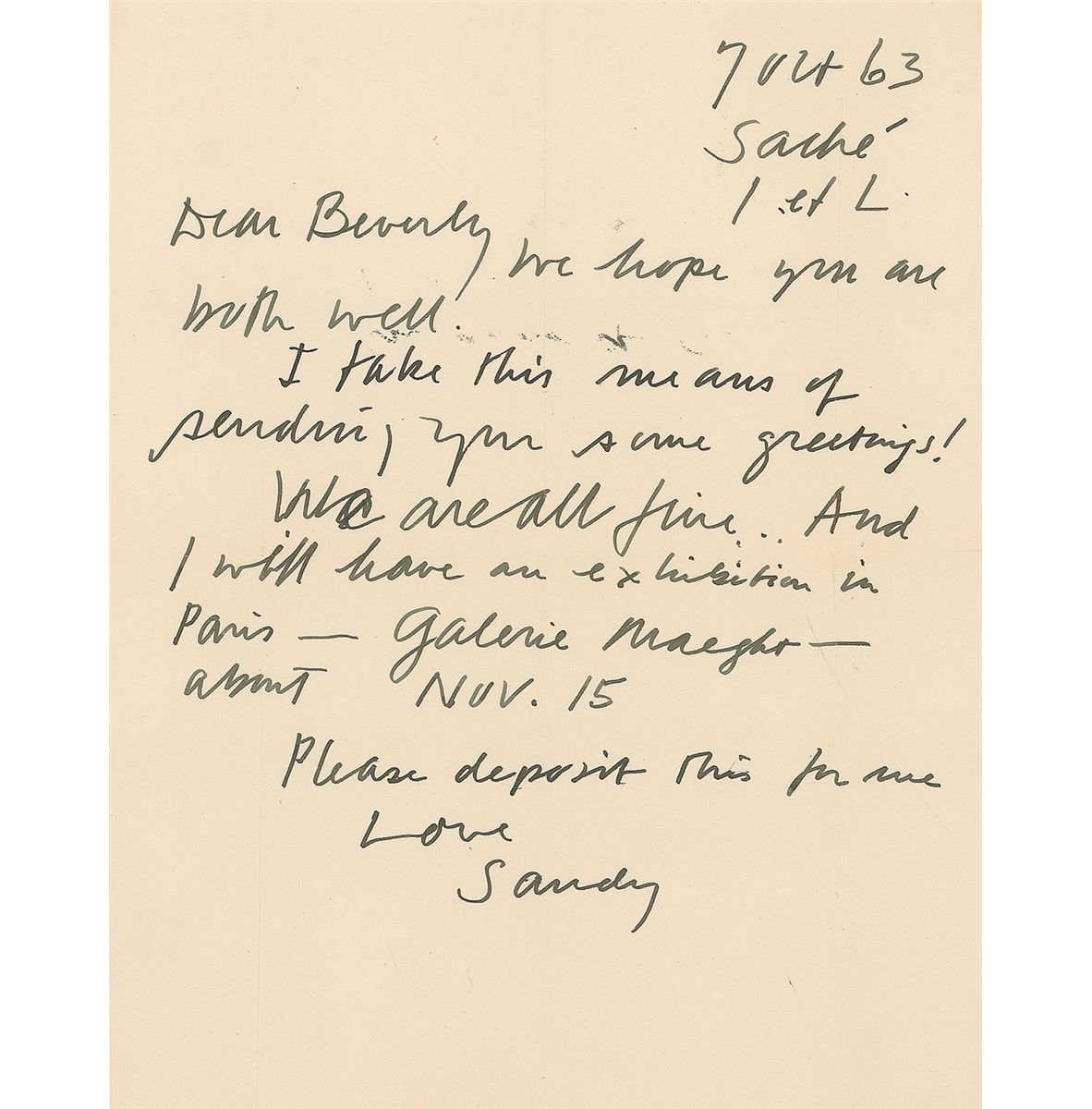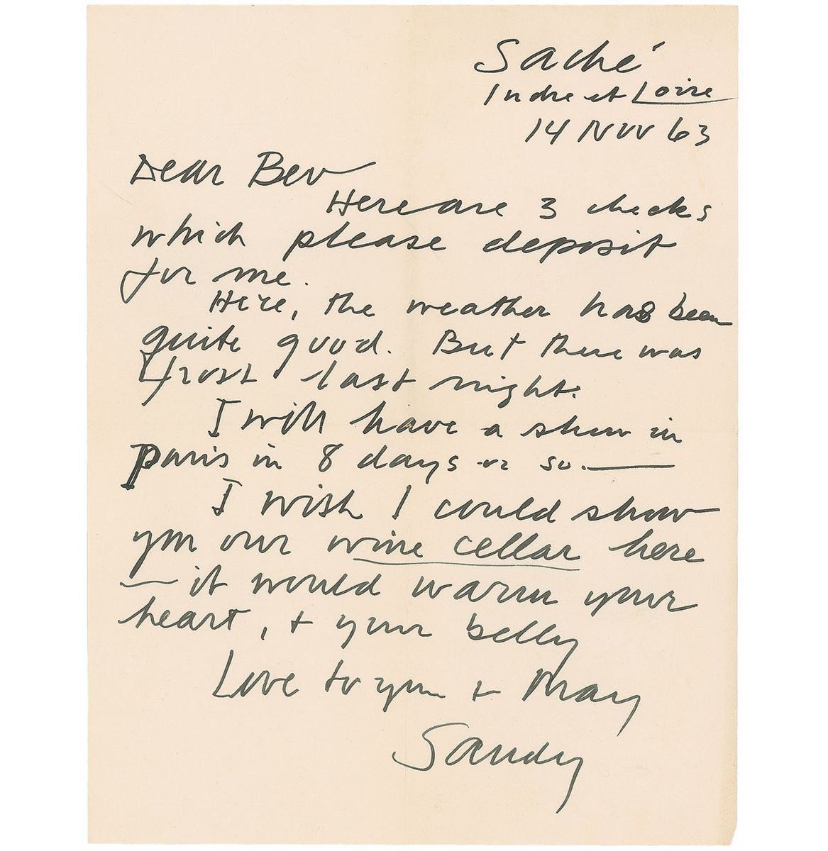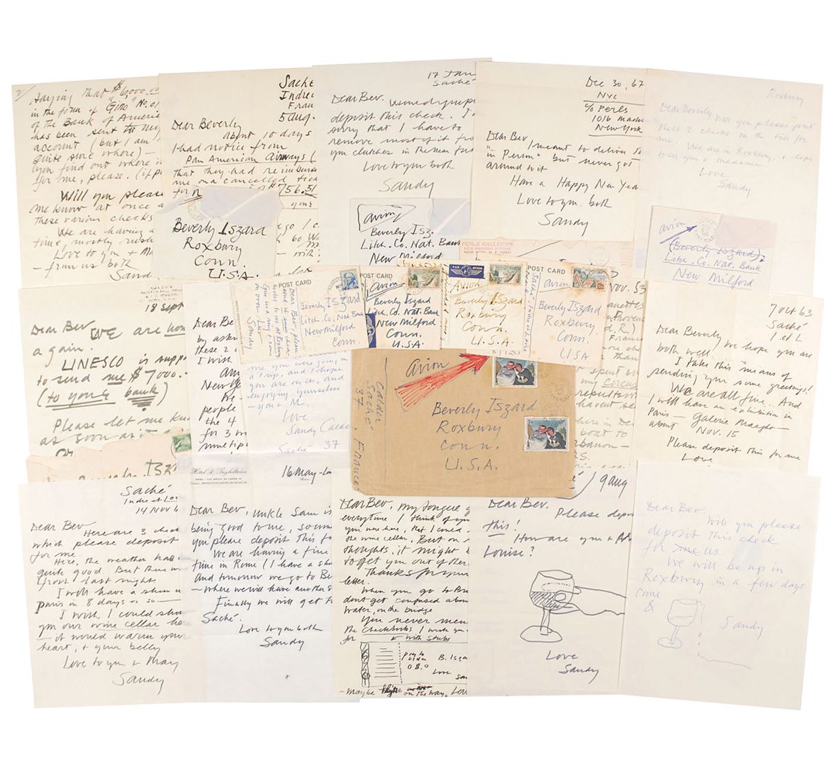 Fantastic archive of correspondence from Calder to his friend and banker Mr. Beverly Iszard, comprised of 19 ALSs, all signed “Sandy” except for one signed “Sandy Calder,” dated 1953 to 1970. The letters amount to a total of 16 pages plus four postcards, all four depicting Calder’s artwork on the front; one postcard features a drawing of a wine glass and mentions gallery owner Klaus Perls. Three additional letters feature sketches of wine glasses as well, and all letters primarily consist of general content regarding finances and directing Iszard to deposit checks, with a few also mentioning Calder’s shows and exhibitions. A letter of November 28, 1953, in part: "I have just spent 3 weeks in Paris following my Circus. I think the results will be good—but haven't seen them as yet." A letter of October 7, 1963, in part: "We are all fine. And I will have an exhibition in Paris—Galerie Maeght—about Nov. 15." One month later, on November 14, 1963, he writes, in part: "I will have a show in Paris in 8 days or so—I wish I could show you our wine cellar here—it would warm your heart, & your belly." A letter of December 18, 1968, in part: “I am sorry not to have seen your gentle visage this trip, and to have [his sketch of clinking glasses] with you!” This letter is accompanied by the original mailing envelope, which is addressed in Calder’s hand and includes a sketch of a dancing woman. All together, there are ten original mailing envelopes addressed in Calder’s hand, nine of which include his handwritten surname, “Calder,” in the return address area. In overall fine condition.