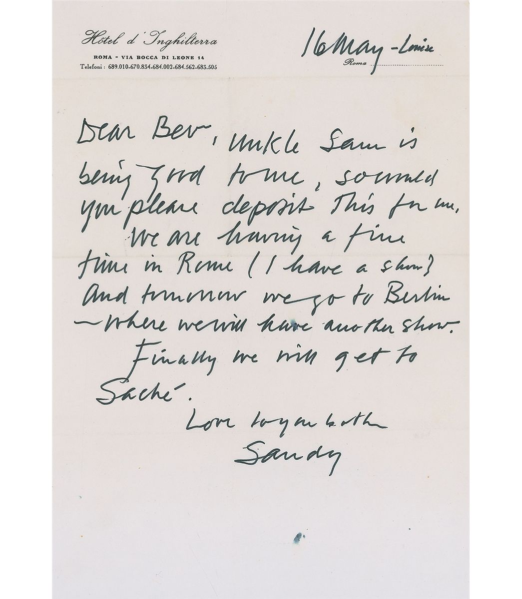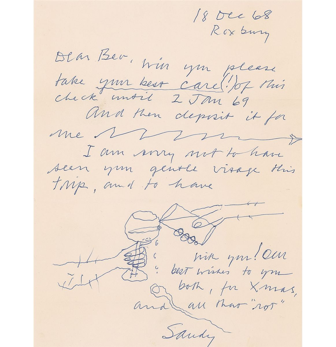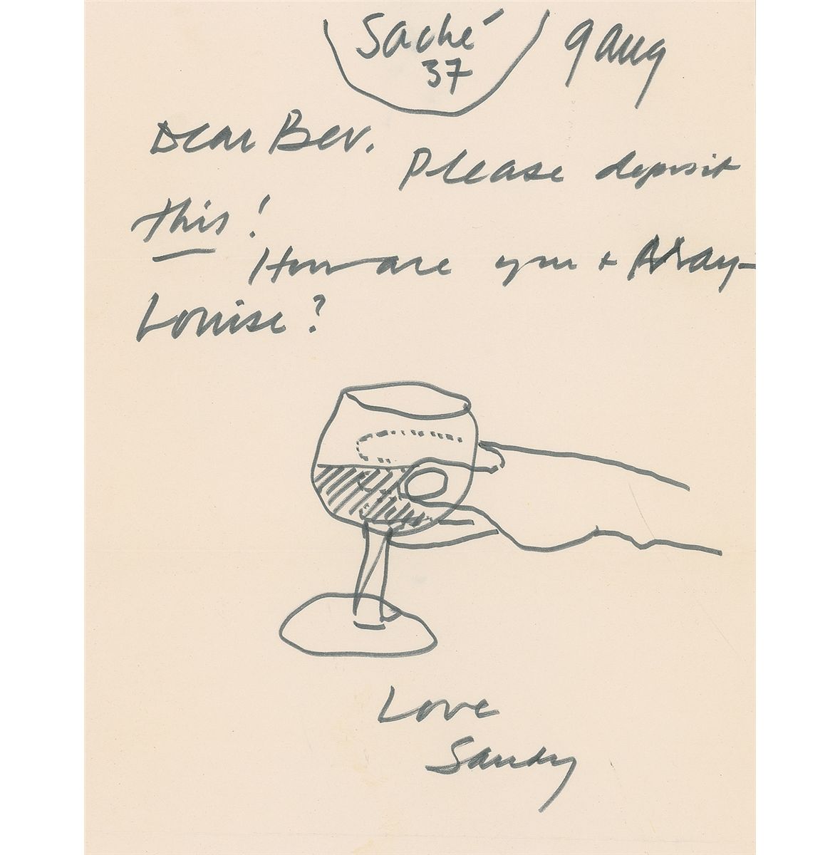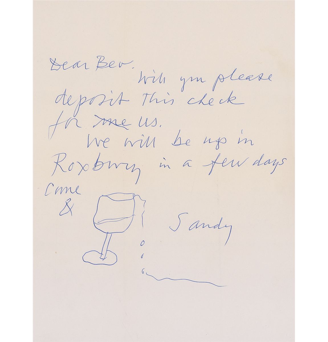 Fantastic archive of correspondence from Calder to his friend and banker Mr. Beverly Iszard, comprised of 19 ALSs, all signed “Sandy” except for one signed “Sandy Calder,” dated 1953 to 1970. The letters amount to a total of 16 pages plus four postcards, all four depicting Calder’s artwork on the front; one postcard features a drawing of a wine glass and mentions gallery owner Klaus Perls. Three additional letters feature sketches of wine glasses as well, and all letters primarily consist of general content regarding finances and directing Iszard to deposit checks, with a few also mentioning Calder’s shows and exhibitions. A letter of November 28, 1953, in part: "I have just spent 3 weeks in Paris following my Circus. I think the results will be good—but haven't seen them as yet." A letter of October 7, 1963, in part: "We are all fine. And I will have an exhibition in Paris—Galerie Maeght—about Nov. 15." One month later, on November 14, 1963, he writes, in part: "I will have a show in Paris in 8 days or so—I wish I could show you our wine cellar here—it would warm your heart, & your belly." A letter of December 18, 1968, in part: “I am sorry not to have seen your gentle visage this trip, and to have [his sketch of clinking glasses] with you!” This letter is accompanied by the original mailing envelope, which is addressed in Calder’s hand and includes a sketch of a dancing woman. All together, there are ten original mailing envelopes addressed in Calder’s hand, nine of which include his handwritten surname, “Calder,” in the return address area. In overall fine condition.