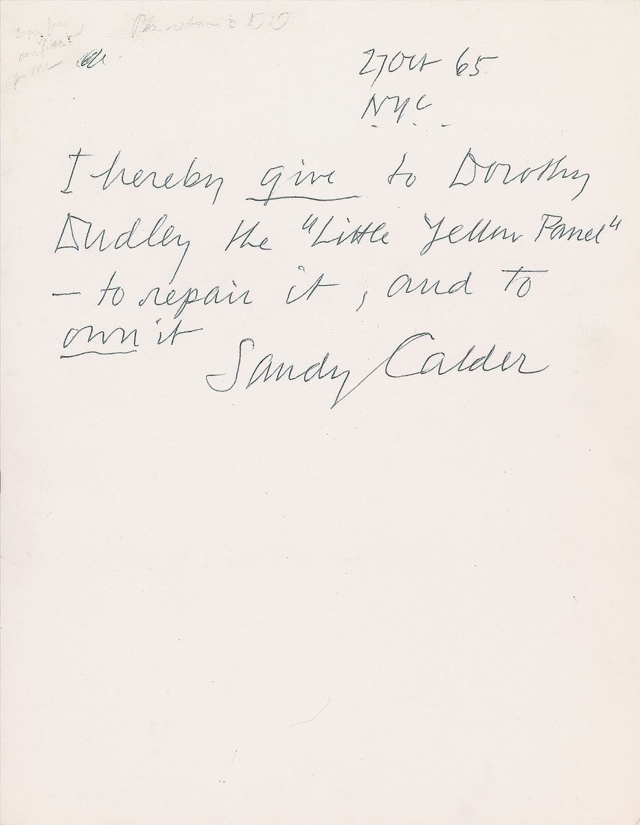 ANS signed “Sandy Calder,” one page, 8.5 x 11, October 27, 1965. In full: “I hereby give to Dorothy Dudley the ‘Little Yellow Panel’—to repair it, and to own it.” In fine condition, with a few erasures in the upper left corner.