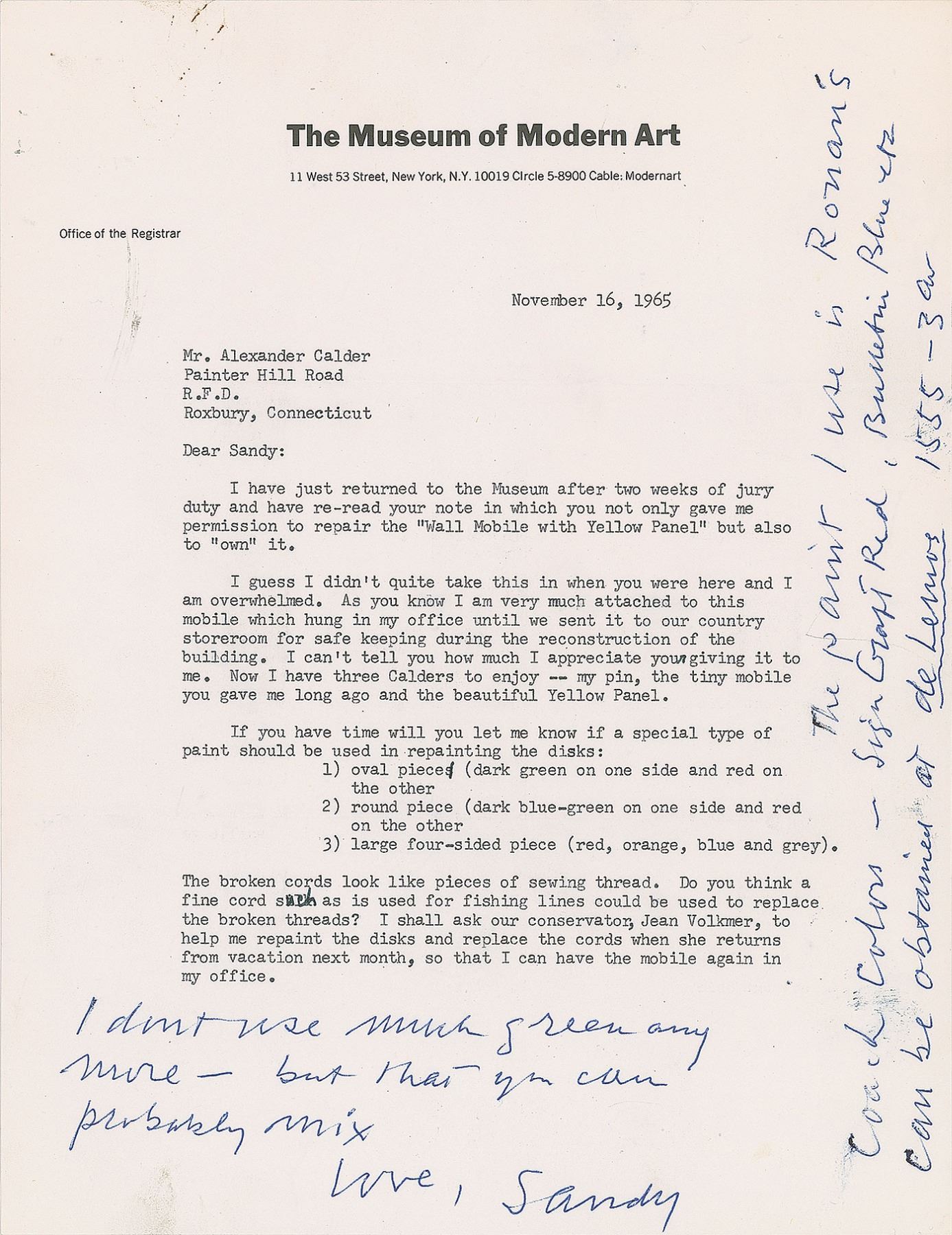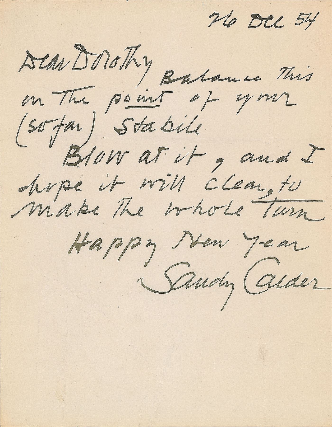 Two items: an ALS, signed "Sandy Calder," one page, 8.5 x 11, December 26, 1954, addressed to "Dorothy," in full: "Balance this on the point of your (so far) stabile. Blow at it, and I hope it will clear, to make the whole turn. Happy New Year"; and an ANS, signed "Love, Sandy," one page, 8.5 x 11, November 16, 1965, penned on a letter addressed to Calder from an employee at The Museum of Modern Art, asking the artist what colors should be used to repaint his gifted work, 'Wall Mobile with Yellow Panel,' as well as how best to replace the work's broken cords. Calder's response: "The paint I use is Ronan's coach colors—Sign craft red, bulletin blue etc, can be obtained at de Lemos 1555–3, I don't use much green any more—but that you can probably mix." In overall fine condition.