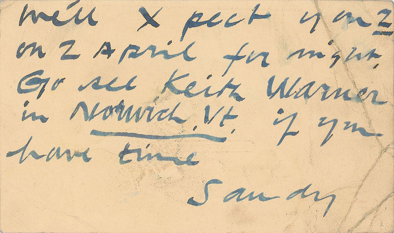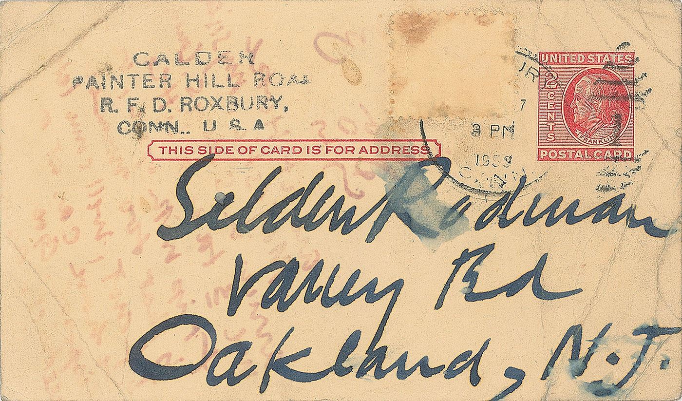 ANS signed "Sandy," one page on a 5.5 x 3.25 postcard, postmarked 1959. A quick note to prolific writer Selden Rodman, in full: "We'll X pect you 2 on 2 April for night. Go see Keith Warner in Norwich, Vt. if you have time." In very good condition, with creasing, soiling, and light staining. Keith and Edna Warner were notable collectors of abstract art, filling their Vermont home with pieces by the likes of Calder, Picasso, and Rouault. Calder was among those interviewed for Rodman's 1961 book Conversations with Artists.