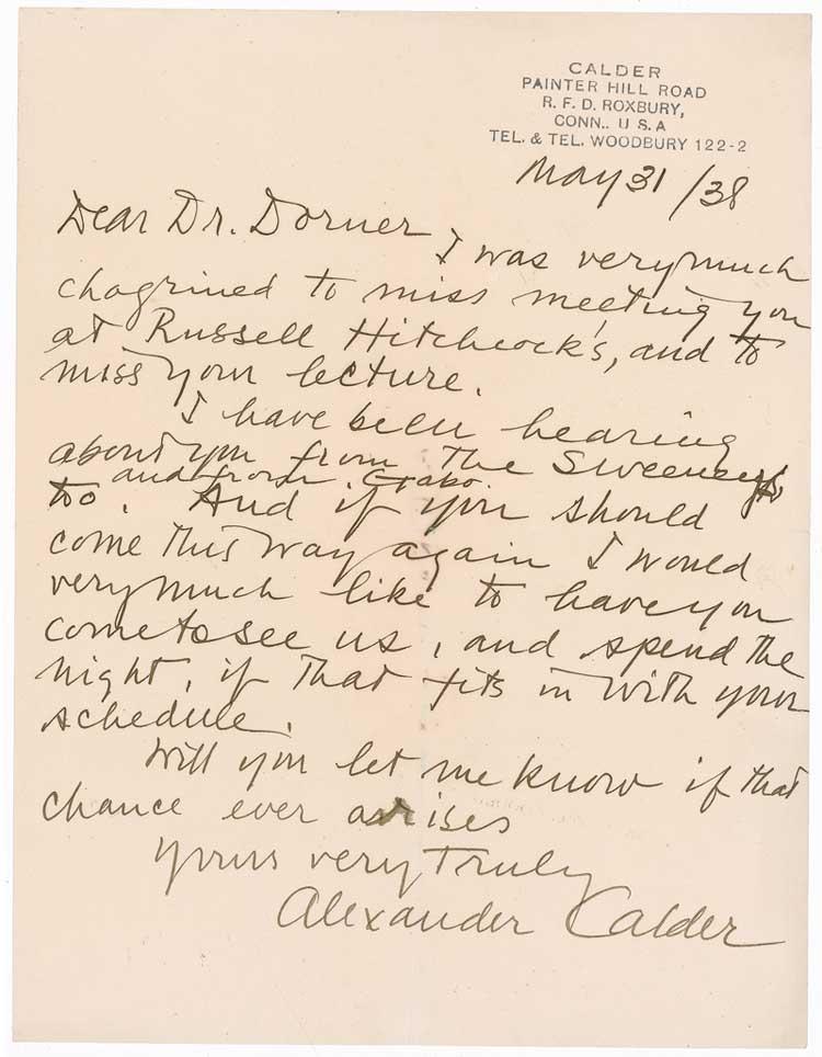 Innovative American sculptor (1898–1976) best known for devising the mobile, the form with which he was most closely associated. Calder also produced large-scale, immobile abstract sculptures known as stabiles, many of which were designed for public spaces. Uncommon ALS, one page, 8.5 x 11, blindstamped personal letterhead, May 31, 1938. Letter to art historian Alexander Dorner (1893–1957). In part: “I was very much chagrined to miss meeting you at Russell Hitchcock’s, and to miss your lecture. I have been hearing about you from the Sweeneys and from Gabo, too. And if you should come this way again I would very much like to have you come to see us, and spend the night, if that fits in with your schedule.” Until 1936, Dorner was the director of the Hanover Museum. In 1937, he emigrated to the United States, where he was director of the museum at the Rhode Island School of Design in Providence, RI, from 1938 until 1941. It was here that he taught at the university until 1948, when he moved to Bennington College in Vermont. Intersecting mailing folds, a couple lightly affecting signature, a mild shade of toning, and a few small edge tears and creases, otherwise fine condition. Pre-certified PSA/DNA and RRAuction COA.