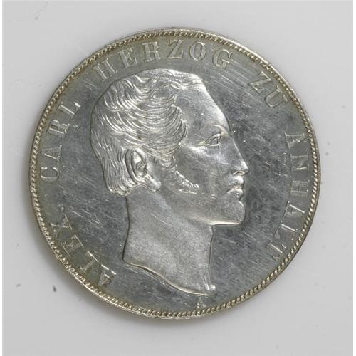 <B>Anhalt-Bernburg. Alexander Carl 2 Taler 1855A,</B></I> KM83, Dav-503, superbly struck with full proof surfaces. This appears to be a Proof striking that has been mis-handled with resulting hairlines and contact marks in the fields. The fields, and the edges, are full mirror-proof surface.<BR><I>From the Blue Ridge Collection</B></I><BR><BR><b>Shipping:</b> Coin/Currency (<a target="_blank" href="http://www.heritageauctions.com/common/shipping.php">view shipping information</a>)