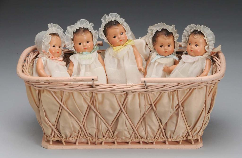 American, circa 1930s. Five all-composition dolls embossed Alexander with jointed necks, shoulders and hips. They have molded brown hair, painted brown eyes, closed mouths and rosy cheeks. Minor crazing on several dolls with minor wear on hair. Wearing crisp organdy dresses and hats with name bibs. Only one dress is tagged "Dionne Quintuplets Madame Alexander". Contained in a wicker basket. Includes Dionne Quintuplet Dolls Booklet with a photo and poem about each doll. Condition (Excellent). Size 6".
