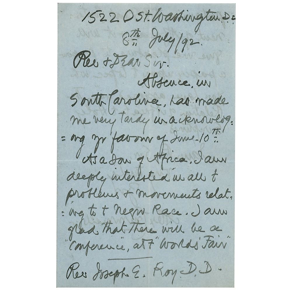 Pioneering African-American minister, abolitionist, academic, and African nationalist (1819–1898) who lived and worked in Liberia for two decades before returning to the United States; W. E. B. Du Bois paid tribute to Crummell in a memorable essay collected in his 1903 book, The Souls of Black Folk. ALS signed “Alex Crummell,†one page both sides, 5 x 7.75, July 8, 1892. Handwritten letter to Rev. Joseph E. Roy, in part: "As a son of Africa, I am deeply interested in all the problems & movements related to the Negro Race. I am glad that there will be a 'conference,' at the 'World's Fair,' pertaining to the Great Continent of Africa; & it will give me pleasure to prepare a paper upon the topic which you have assigned me: 'The Relation of Africa to the Holy Scriptures.'" In fine condition.