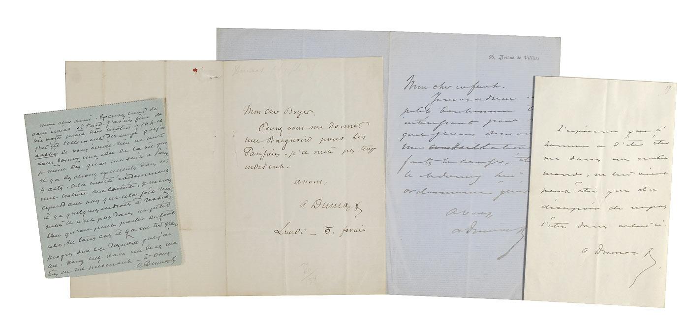 French writer (1824–1895), the illegitimate son of famed novelist Alexandre Dumas. The younger Dumas novel La Dame aux Camelias became the basis of Verdi’s opera ‘La Traviata.’ Four one-page untranslated ALSs in French, each signed “A. Dumas,” ranging in size from 4.5 x 5 to 5.25 x 8.25, no date. A transmittal envelope is affixed along the side of one letter. In overall very good condition, with intersecting horizontal and vertical folds touching his name on three examples, a few creases and wrinkles, a couple of small holes, and scattered toning.