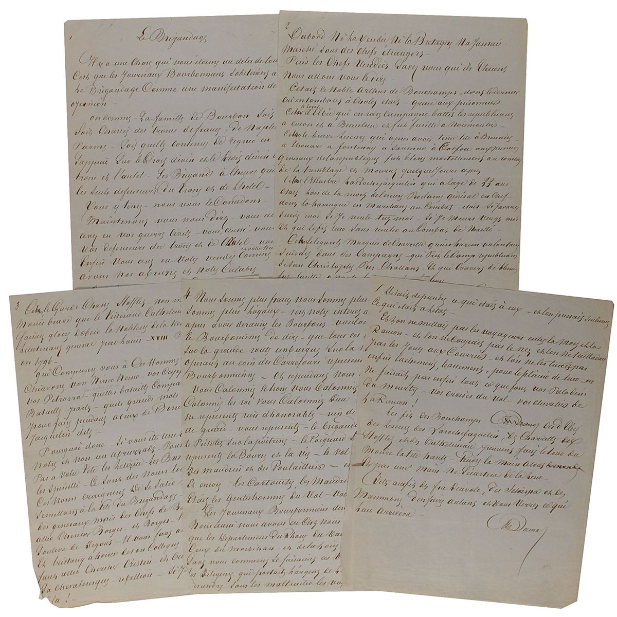 Handwritten manuscript in French entitled ‘Le Brigandage,’ 8.5 x 11, five pages, written in Dumas’s hand and signed at the conclusion, “Alex. Dumas.” Manuscript begins (translated): “The one thing which amazes us more than anything else is that the Bourbon newspapers insist on regarding brigandage as a justifiable manifestation of their political views.” The manuscript goes on to mention the War in the Vendee; it is most likely related to Dumas’s novel Les Louves de Machecoul, which deals with the Vendee uprising. Central vertical and horizontal folds, light scattered creases, and small edge chips and tears, otherwise fine condition. Accompanied by a full translation. An exceedingly scarce and desirable work by the acclaimed French author.