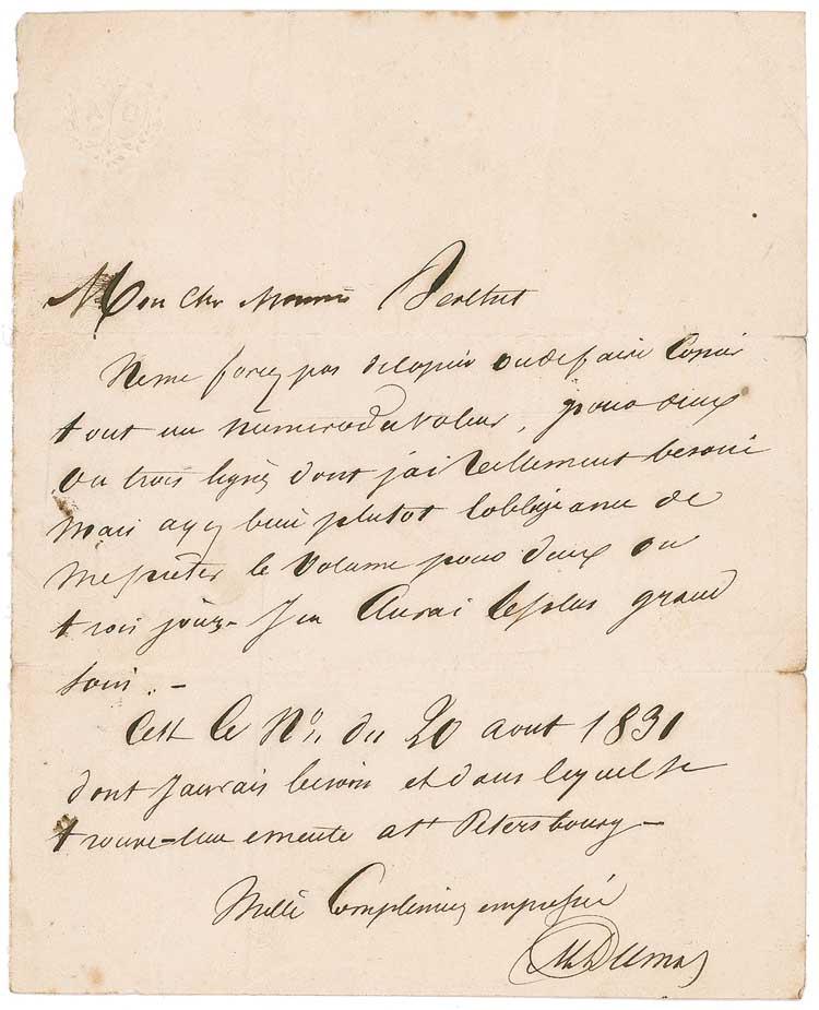 Distinguished French novelist (1802–1870) of such historical classics as The Count of Monte Cristo, The Three Musketeers, and The Man in the Iron Mask. ALS in French, signed “Al. Dumas,” one page, 4.25 x 5.25, personal letterhead, no date. Untranslated letter to Italian poet Giovanni Berchet. Intersecting folds and creases, a rough left edge, and a bit of trivial foxing, otherwise fine condition. Pre-certified PSA/DNA and RRAuction COA.