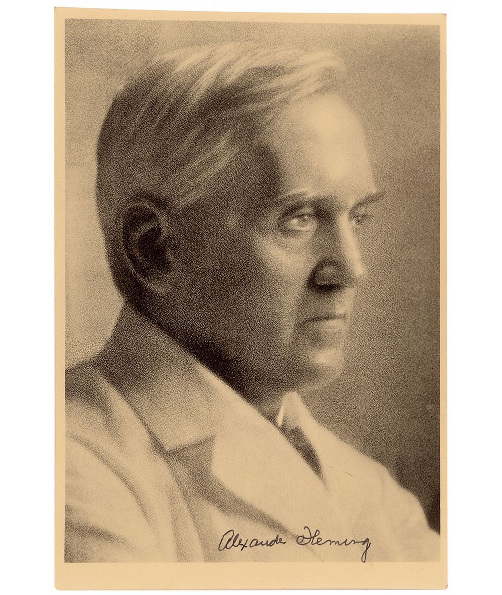 Scottish bacteriologist (1881–1955) who shared the 1945 Nobel Prize in Medicine for his role in the discovery and isolation of penicillin. Vintage matte-finish 4.25 x 6.25 photo of an artist’s portrait of Fleming, signed in black ink. In fine condition, with a few trivial surface creases and a light paperclip impression to top edge.