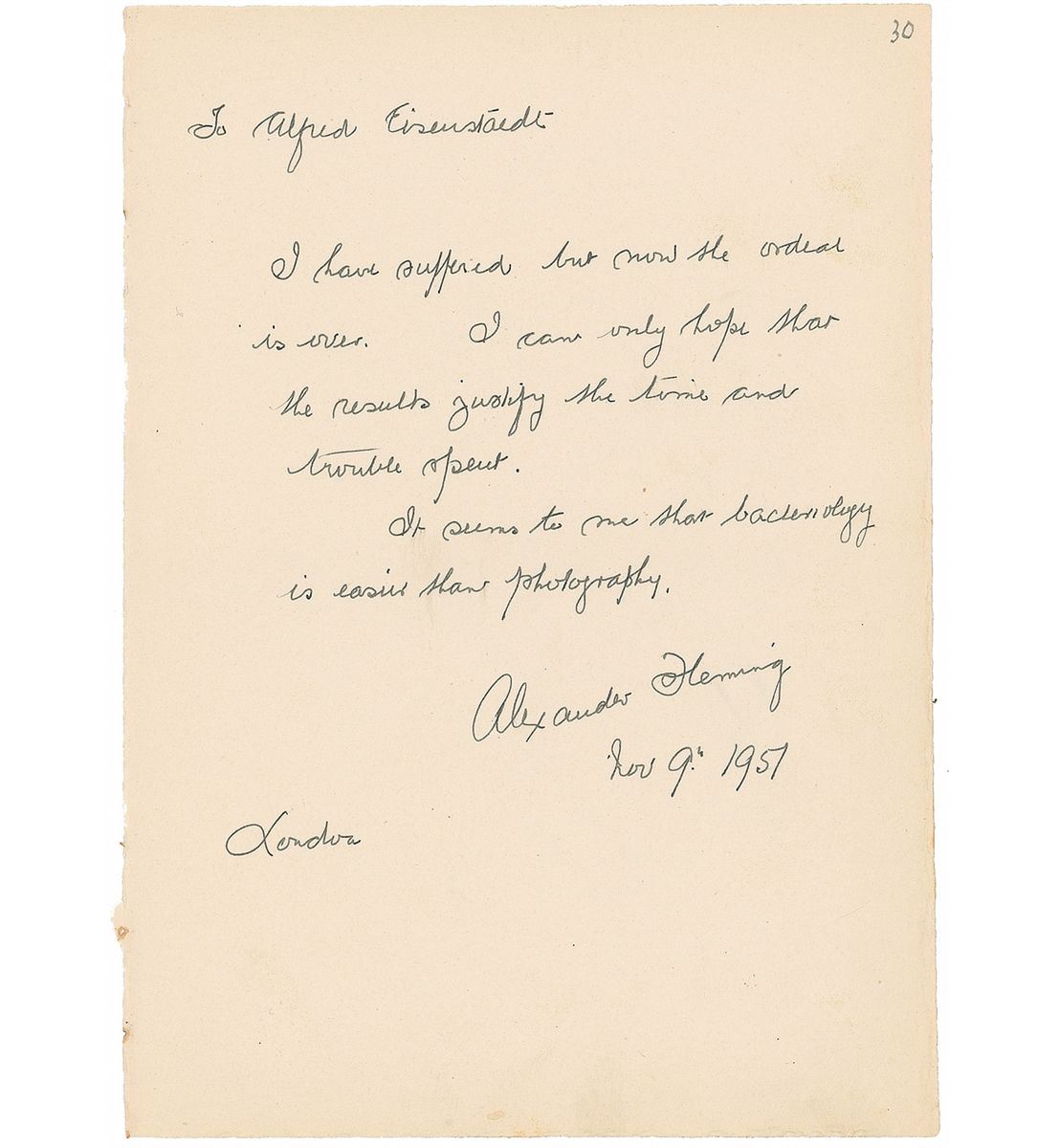 Fleming published many articles on bacteriology and was an antibiotics pioneer; Eisenstaedt was a German-born American photojournalist whose work appeared on more than 90 Life covers. The “ordeal” Fleming writes of was no doubt his 1951 photography session with Eisenstaedt. The photographer captured Fleming in the lab—perhaps the most well-known image is that of Fleming carefully studying an upheld petri dish—and “the results” of this session were included in his “Portfolio of Famous Britons” which appeared in the January 14, 1952 issue of Life magazine. Excellent association between two leaders in their respective fields, with a little self-deprecating humor for good measure.