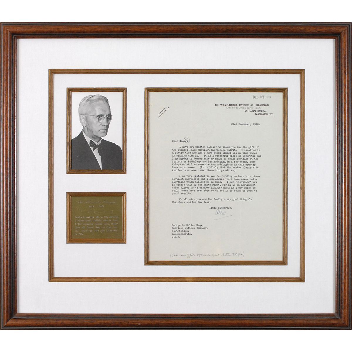 TLS signed “Alec,” one page, 7.75 x 10, Wright-Fleming Institute of Microbiology letterhead, December 21, 1948. Letter to George Wells of the American Optical Company. In part: “I have not written earlier to thank you for the gift of the Spencer Phase Contrast Microscope outfit. I received it a little time ago and I have spent almost all my time since in playing with it. It is a wonderful piece of apparatus and I am hoping to demonstrate, by means of phase contrast at the Society of Pathology and Bacteriology…some things which I am sure the bacteriologists in this country have never seen…I can assure you I have never had a plaything which pleased me so much. I say ‘plaything’ but of course that is not quite right, for it is an instrument which allows us to observe living things in a way which we could never have been able to do and it is bound to lead to great results.” Double-cloth-matted and framed with a small photo and a small plaque to an overall size of 20.25 x 18. In fine condition, with intersecting folds, two staple holes, and an office stamp and pencil notation.