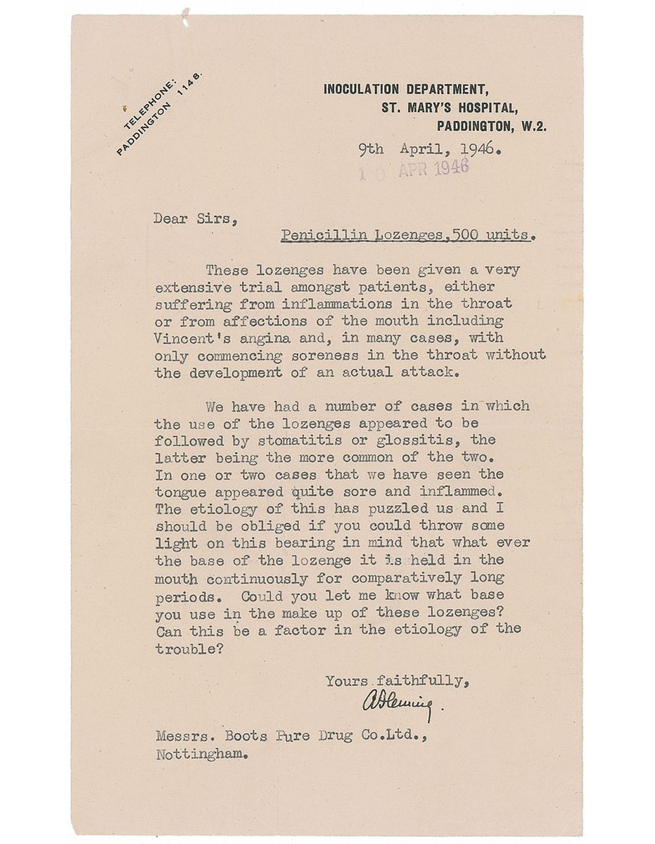 Scottish bacteriologist (1881–1955) who shared the 1945 Nobel Prize in Medicine for his role in the discovery and isolation of penicillin. Two letters: TLS signed “A. Fleming,” one page, 5 x 8, Inoculation Department St. Mary’s Hospital letterhead, April 9, 1946. Letter to Messrs. Boots Pure Drug Co. Ltd. regarding “Penicillin Lozenges, 500 units.” In full: “These lozenges have been given a very extensive trial amongst patients, either suffering from inflammations in the throat or from affections of the mouth including Vincent’s angina and, in many cases, with only commencing soreness in the throat without the development of an actual attack. We have had a number of cases in which the use of the lozenges appeared to be followed by stomatitis or glossitis, the latter being the more common of the two. In one or two cases that we have seen the tongue appeared quite sore and inflammed [sic]. The etiology of this has puzzled us and I should be obliged if you could throw some light on this bearing in mind that what ever the base of the lozenge it is held in the mouth continuously for comparatively long periods. Could you let me know what base you use in the make up of these lozenges? Can this be a factor in the etiology of the trouble?” Also includes another another TLS signed “A. Fleming,” one page, 4.5 x 3.5, identical letterhead, April 27, 1945. In full: “I shall be very grateful if you could let me have the composition of the medium on which you spore Penicillium notatum. I hope there is no secret about it and if there is not I want to pass it on to Dr. St. John Brooks at the National Collection for Type Cultures.” In overall fine condition, with toning to trimmed edges of one letter and scattered creases. It was Penicillium notatum that led Fleming to his important discovery—after a culture had been accidentally contaminated by the green mold, Fleming isolated it, grew it, and found that the substance it produced was capable of killing many types of common infectious bacteria. This is an exceptional pairing of letters, both directly pertaining to the pioneer’s work in the medical field.