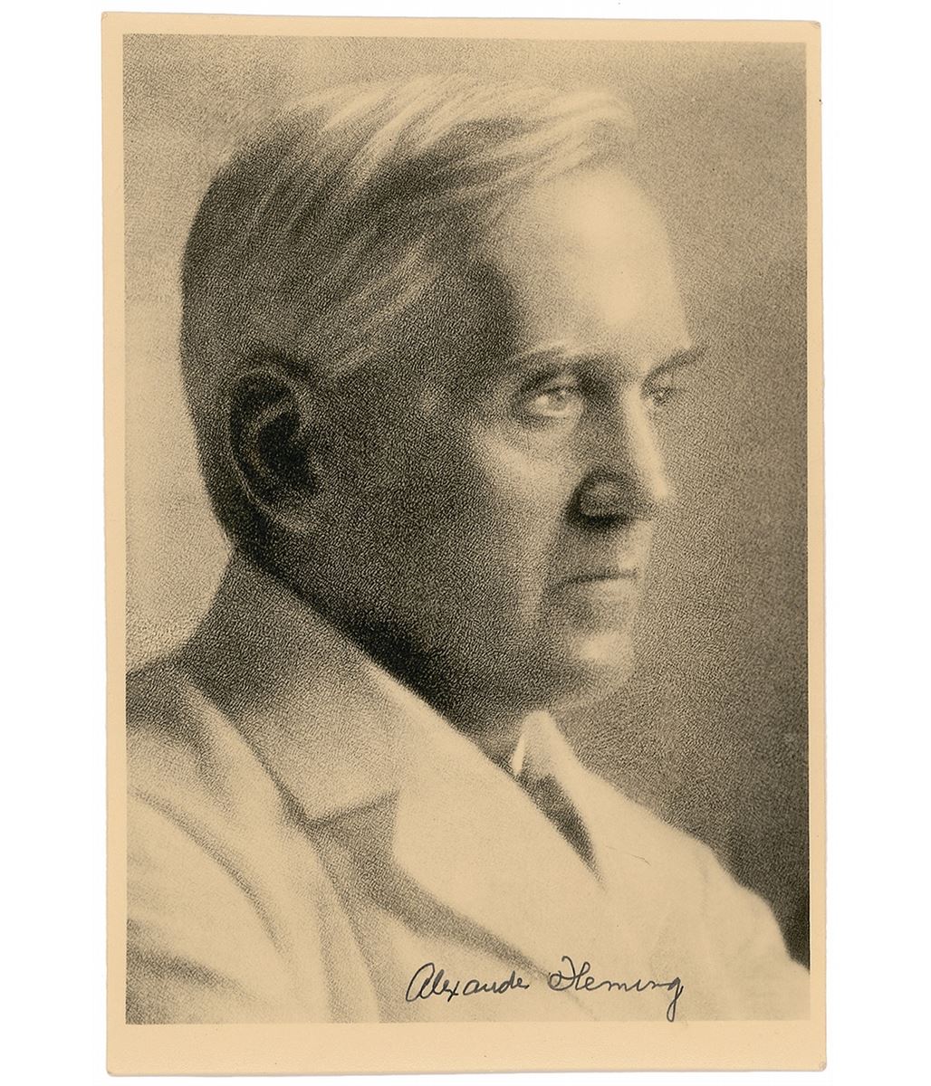 Scottish bacteriologist (1881–1955) who shared the 1945 Nobel Prize in Medicine for his role in the discovery and isolation of penicillin. Vintage matte-finish 4.25 x 6.25 photo of an artist’s portrait of Fleming, signed in black ink. In fine condition, with a few faint surface creases and a trivial paperclip impression to top edge.