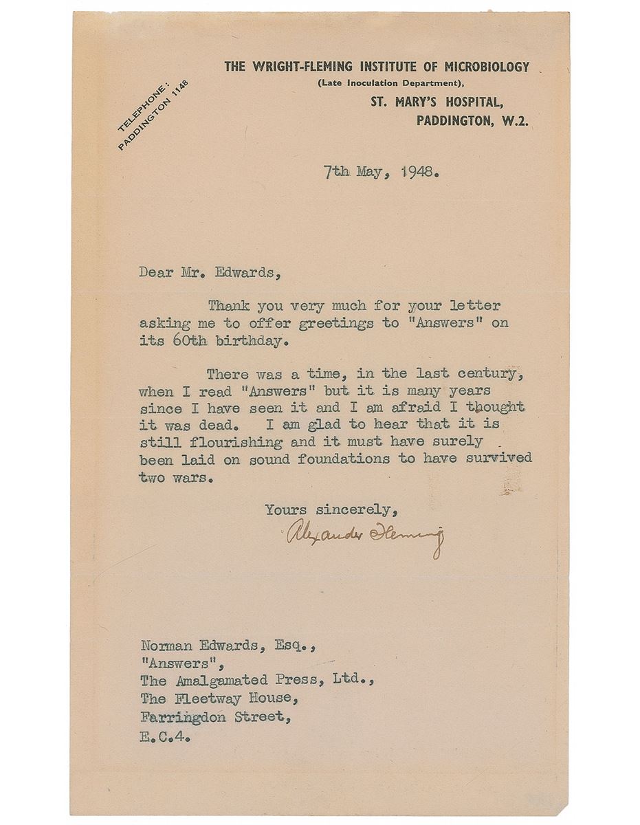 TLS, one page, 5 x 8, Wright-Fleming Institute of Microbiology letterhead, May 7, 1948. Letter to Norman Edwards of the magazine Answers, who had sent birthday wishes, in part: “There was a time, in the last century, when I read 'Answers' but it is many years since I have seen it and I am afraid I thought it was dead. I am glad to hear that it is still flourishing and it must have surely been laid on sound foundations to have survived two wars." In very good condition, with a small tear to top edge, several horizontal folds, and toning from previous display.