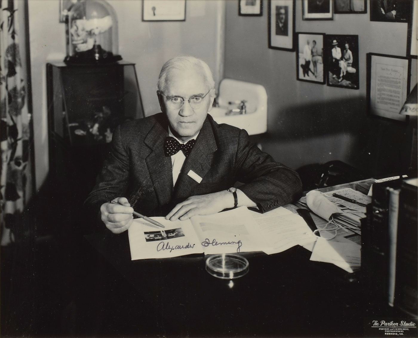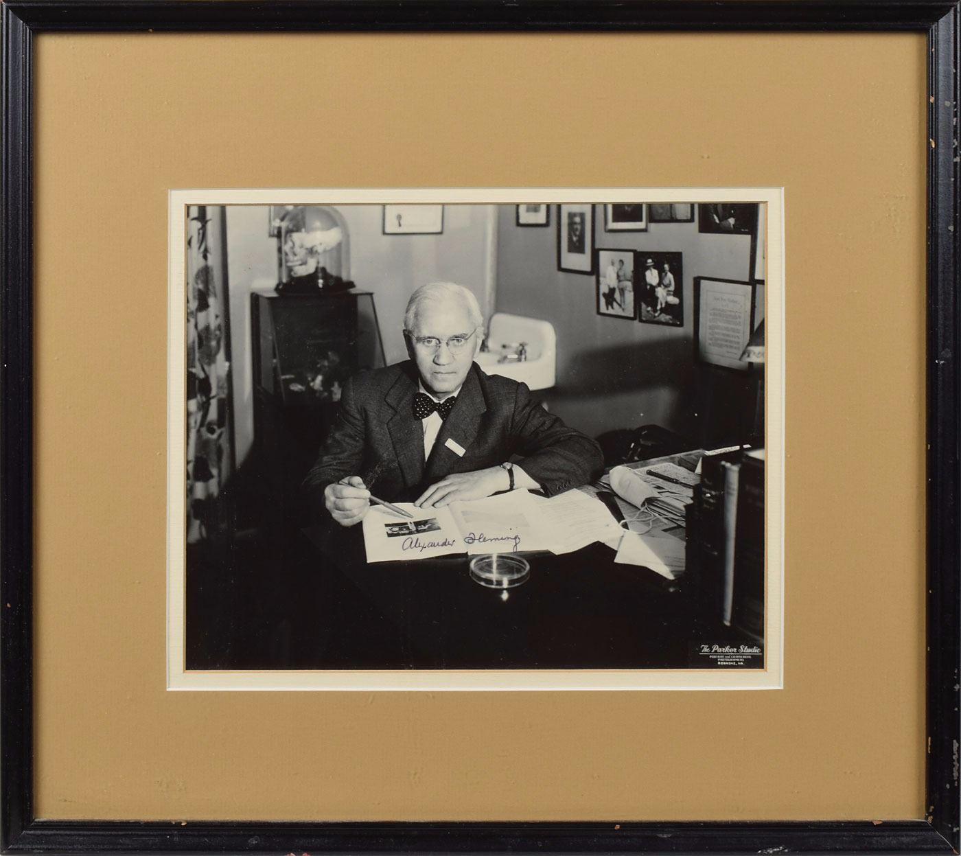 Scottish bacteriologist (1881–1955) who shared the 1945 Nobel Prize in Medicine for his role in the discovery and isolation of penicillin. Wonderful vintage glossy 9.25 x 7.5 Parker Studio photo of Fleming seated at his office desk and surrounded by various scientific paraphernalia including a Petri dish and human skull, neatly signed on the open book in black ink. Double-matted and framed to 15.5 x 14.75. In fine condition. An ideal portrayal of the extolled researcher.
