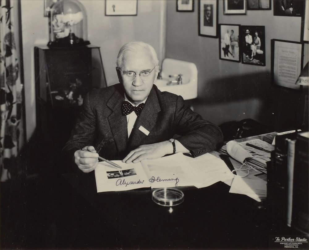 Scottish bacteriologist (1881–1955) who shared the 1945 Nobel Prize in Medicine for his role in the discovery and isolation of penicillin. Wonderful vintage glossy 9.25 x 7.5 Parker Studio photo of Fleming seated at his office desk and surrounded by various scientific paraphernalia including a Petri dish and human skull, neatly signed on the open book in fountain pen. Double-matted and framed to 15.5 x 14.75. In fine condition. Originally purchased from Paul C. Richards Autographs. An ideal portrayal of the extolled researcher.