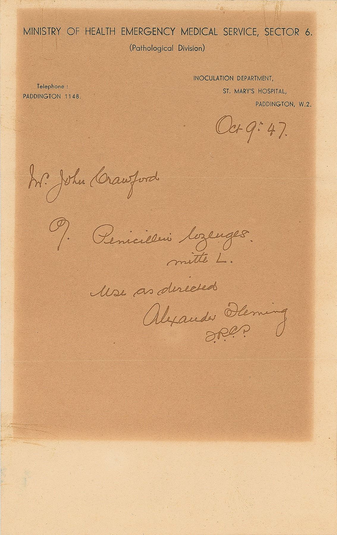 Scottish bacteriologist (1881–1955) who shared the 1945 Nobel Prize in Medicine for his role in the discovery and isolation of penicillin. Autograph prescription, signed “Alexander Fleming, F.R.C.S.,” one page, 5 x 8, Ministry of Health Emergency Medical Service letterhead, October 9, 1947. Handwritten prescription, in full: "Mr. John Crawford, Penicillin lozenges, mitte L. use as directed." In very good to fine condition, with paperclip impressions to the edges, and a block of toning from prior display. A remarkable autograph related to his groundbreaking discovery.