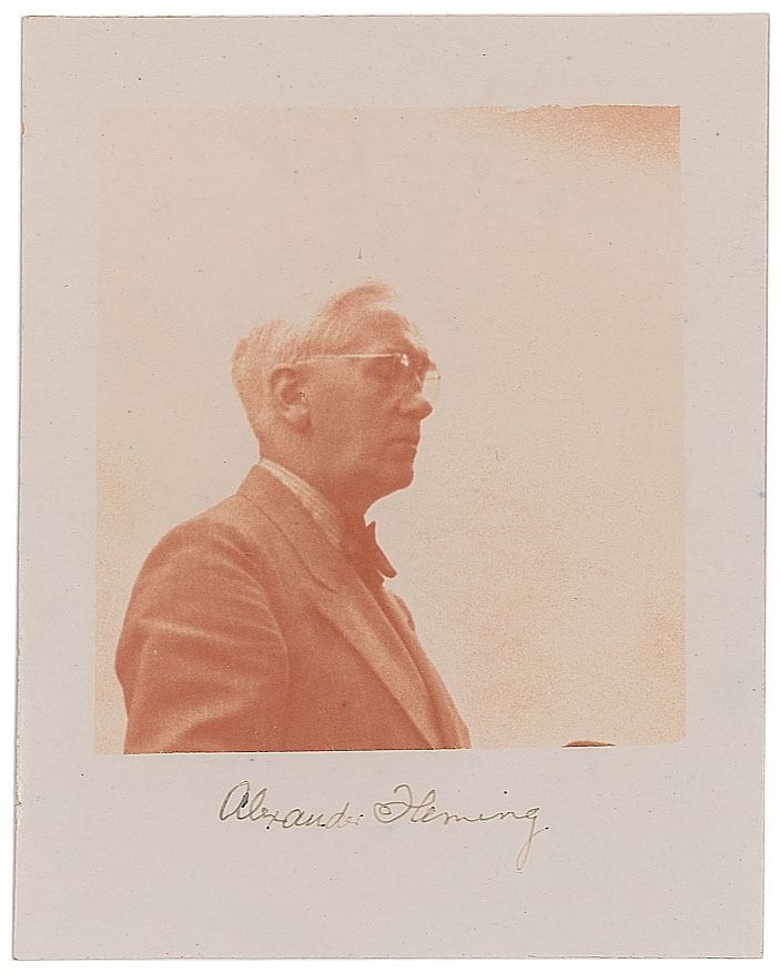 Uncommon color glossy 4.25 x 5.25 photo of Alexander Fleming in a head-and-shoulders profile pose, signed in ink. In fine condition, with fading to both the image and the signature.