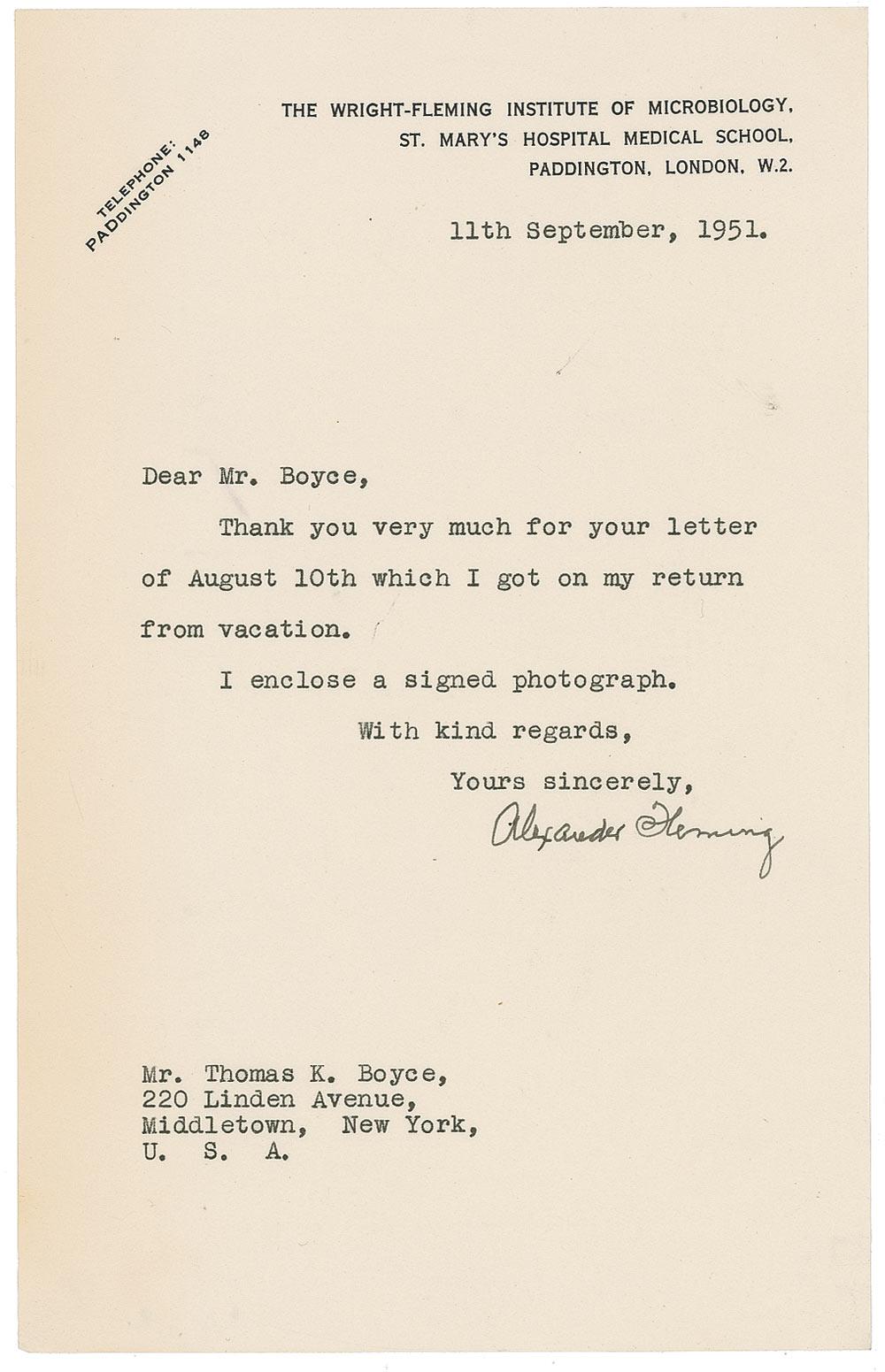 Scottish bacteriologist (1881–1955) who shared the 1945 Nobel Prize in Medicine for his role in the discovery and isolation of penicillin. TLS, one page, 5.5 x 8.5, Wright-Fleming Institute of Microbiology letterhead, September 11, 1951. Brief letter to a collector. In part: “Thank you very much for your letter of August 10th which I got on my return from vacation.” In fine condition.