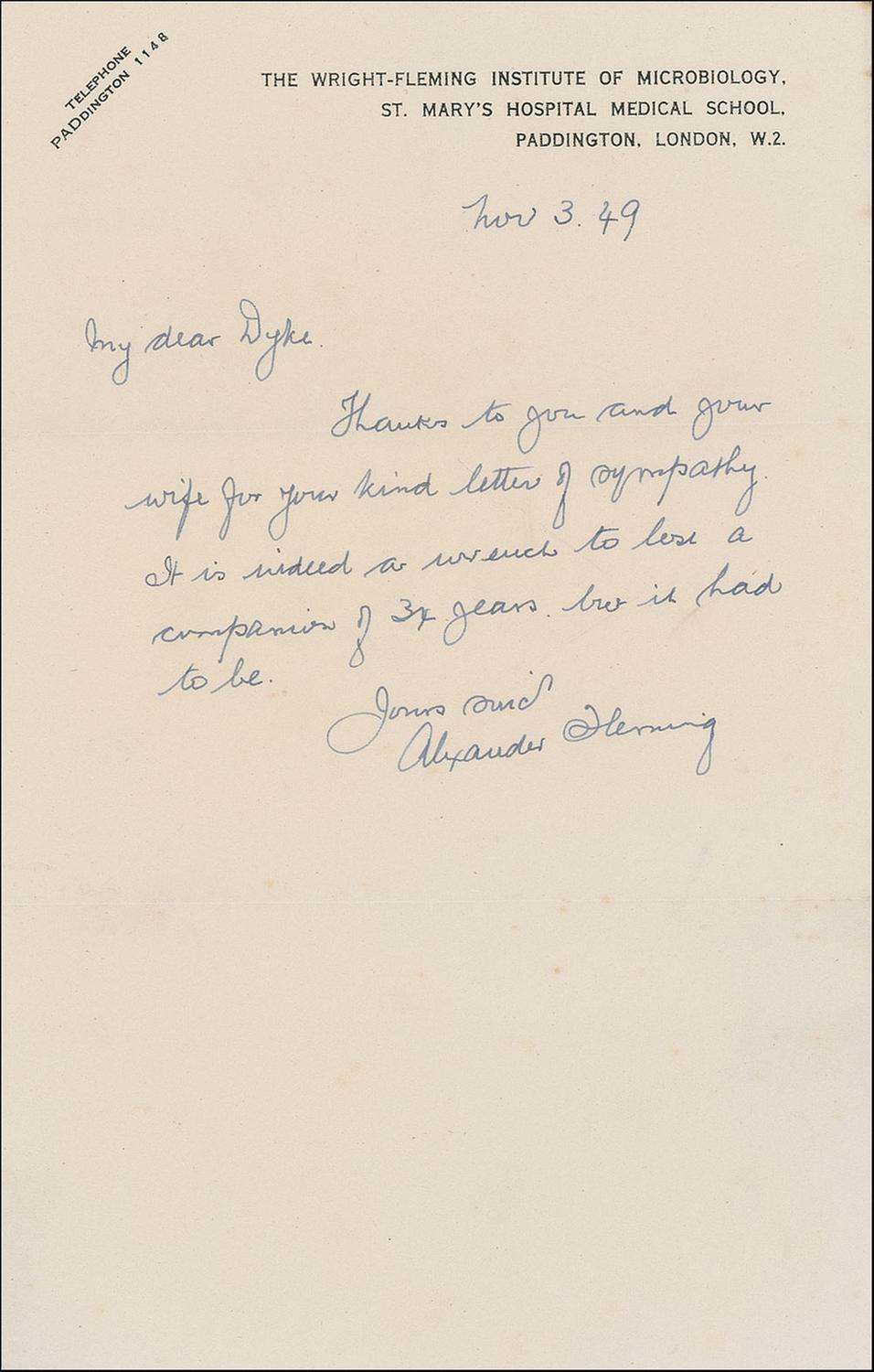 Scottish bacteriologist (1881–1955) who shared the 1945 Nobel Prize in Medicine for his role in the discovery and isolation of penicillin. ALS, one page, 5.5 x 8.5, The Wright-Fleming Institute of Microbiology letterhead, November 3, 1949. The scientist writes a colleague regarding the loss of Fleming’s wife. In part: “It is indeed a wrench to lose a companion of 34 years but it had to be.” In fine condition, with scattered wrinkling. Accompanied by an unsigned photo. A heartfelt yet still analytical response from a man whose work saved countless lives.