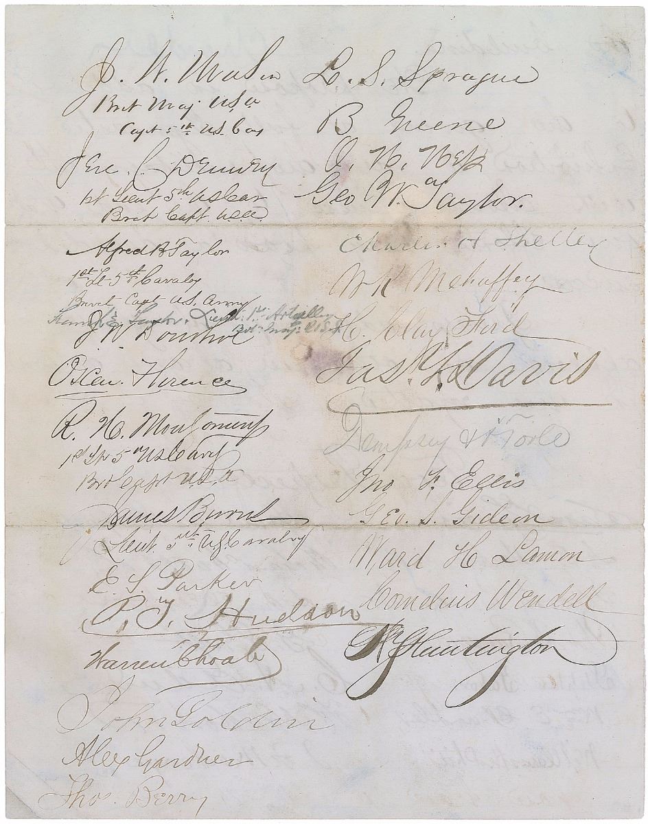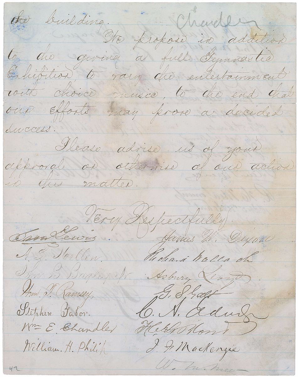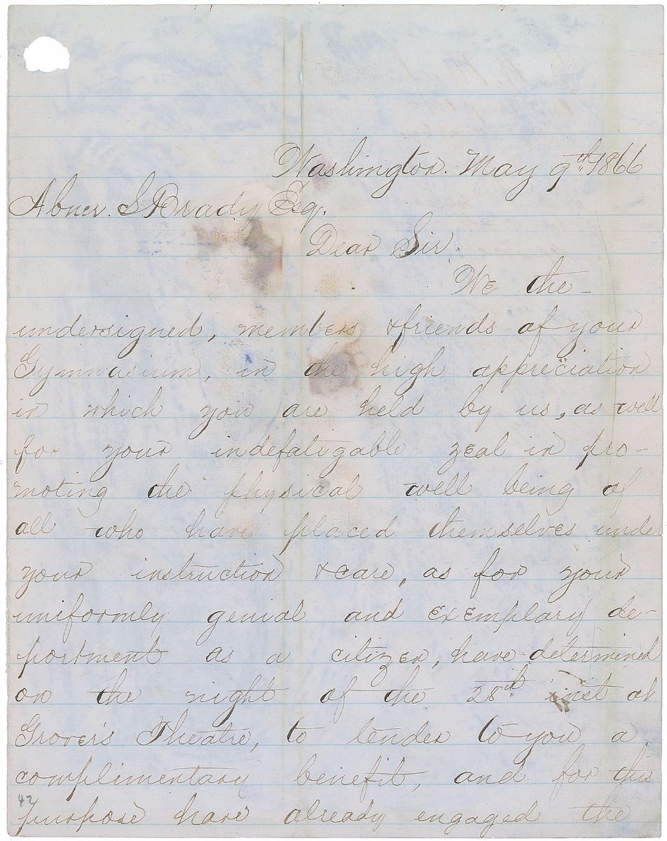 Washington-based photographer (1821–1882) who learned the craft while managing Mathew Brady’s studio and achieved fame for his images of the Civil War and Abraham Lincoln. LS signed “Alex Gardner,” three pages on two sheets, 7.75 x 9.75, May 9, 1866. Letter to strongman and gymnast Abner S. Brady inviting him to a benefit at Grover's Theatre in Washington to be held in his honor, signed at the conclusion by over forty Washington notables. In part: “We the undersigned, members & friends of your Gymnasium, in the high appreciation in which you are held by us, as well for your indefatigable zeal in promoting the physical well being of all who have placed themselves under your instruction & care, as for your uniformly genial and exemplary deportment as a citizen…to tender to you a complimentary benefit, and for this purpose have already engaged the building. We propose in addition to the giving a full Gymnastic Exhibition to vary the entertainment with choice music, to the end that our efforts may prove a decided success.” In addition to Gardner, other signers include fellow photographer John Goldin, Lincoln’s friend and bodyguard Ward Hill Lamon, Ford’s Theatre stage manager Henry Clay Ford, Grant’s military secretary Ely S. Parker, Grant's aide-de-camp P. T. Hudson, Mayor Richard Wallach, and future Secretary of the Navy William E. Chandler. In very good condition, with intersecting folds and heavy dampstaining and soiling.