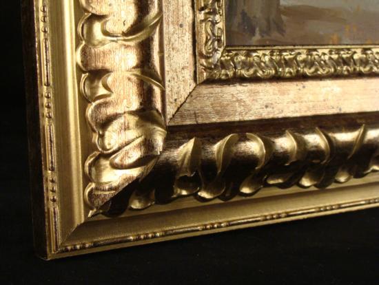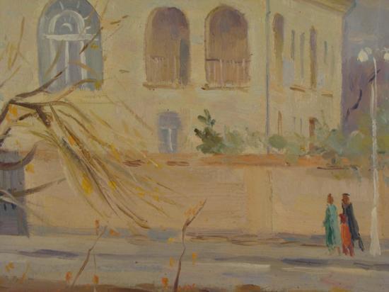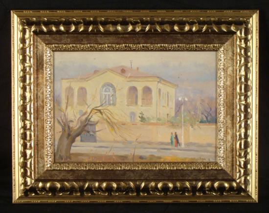 This is an original painting by artist Alexander Gevorkyan. It portrays a building with two figures strolling along on the sidewalk outside. The brushstrokes are Impressionist in style, and the scene has a nice sense of light. Artist: Alexander Gevorkyan Title: Unknown Medium: Original oil on canvas Signature: Signed by the artist in pencil on back Image size: 8 3/4 x 13 inches Frame size: 15 3/4 x 20 inches Framing: Custom framed, in gold painted decorative wood frame Certificate of Authenticity: Included This is a nice original oil painting for any art collector. *
