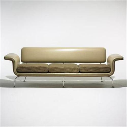 Featuring Checker upholstery #1923. Signed with applied disc manufacturer's label to underside: [Herman Miller Inc. Zeeland, Mich.].
