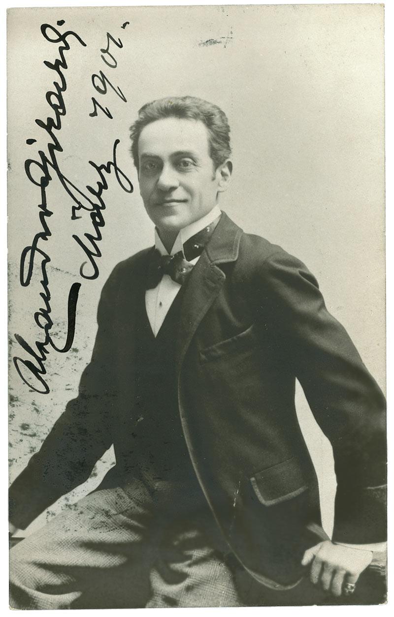 Actor and singer (1850-1918), associated with Johann Strauss and the Golden Age of the Viennese Operetta. Vintage matte-finish 3.25 x 5.25 postcard three-quarter length photo, signed vertically in fountain pen, “Alexander Girardi, March 1901.” Accompanied by a color postcard showing him with actress Hansi Niese in his most famous role as “Valentin” in which he sang the renowned “Hobellied” (Planing Song). In fine condition, with silvering to lower portion of image, and scattered light ink marks to left edge, lightly affecting first name of signature. RRAuction COA.
