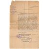 Well-regarded Russian composer (1865–1936) best known for his lush orchestral works, including nine symphonies and concerti for various instruments. Untranslated DS in Cyrillic, one page, 8.5 x 13.75, September 3, 1927. A certificate of graduation from the Leningrad State Conservatory. In very good condition, with toning, tears and areas of paper loss, and old tape on the reverse reinforcing the intersecting folds.