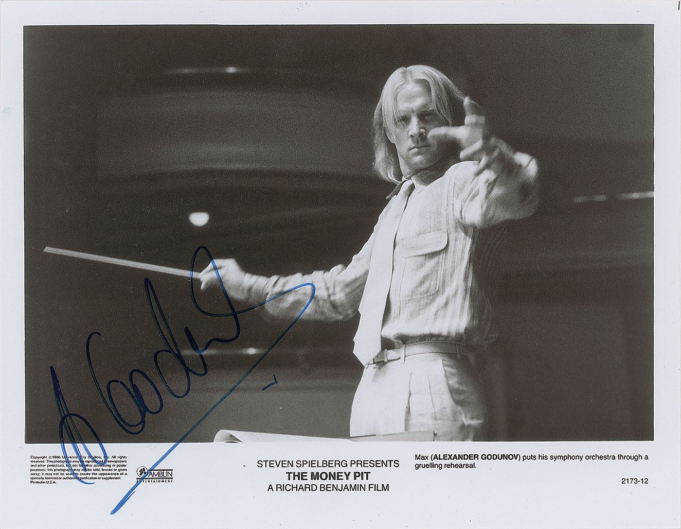Glossy 10.25 x 8 Amblin Entertainment publicity photo of Alexander Godunov as Max Beissart from the 1986 film The Money Pit, signed in blue felt tip, "A. Godunov." In fine condition. From the Harvey and Rhoda Kuflik Collection.