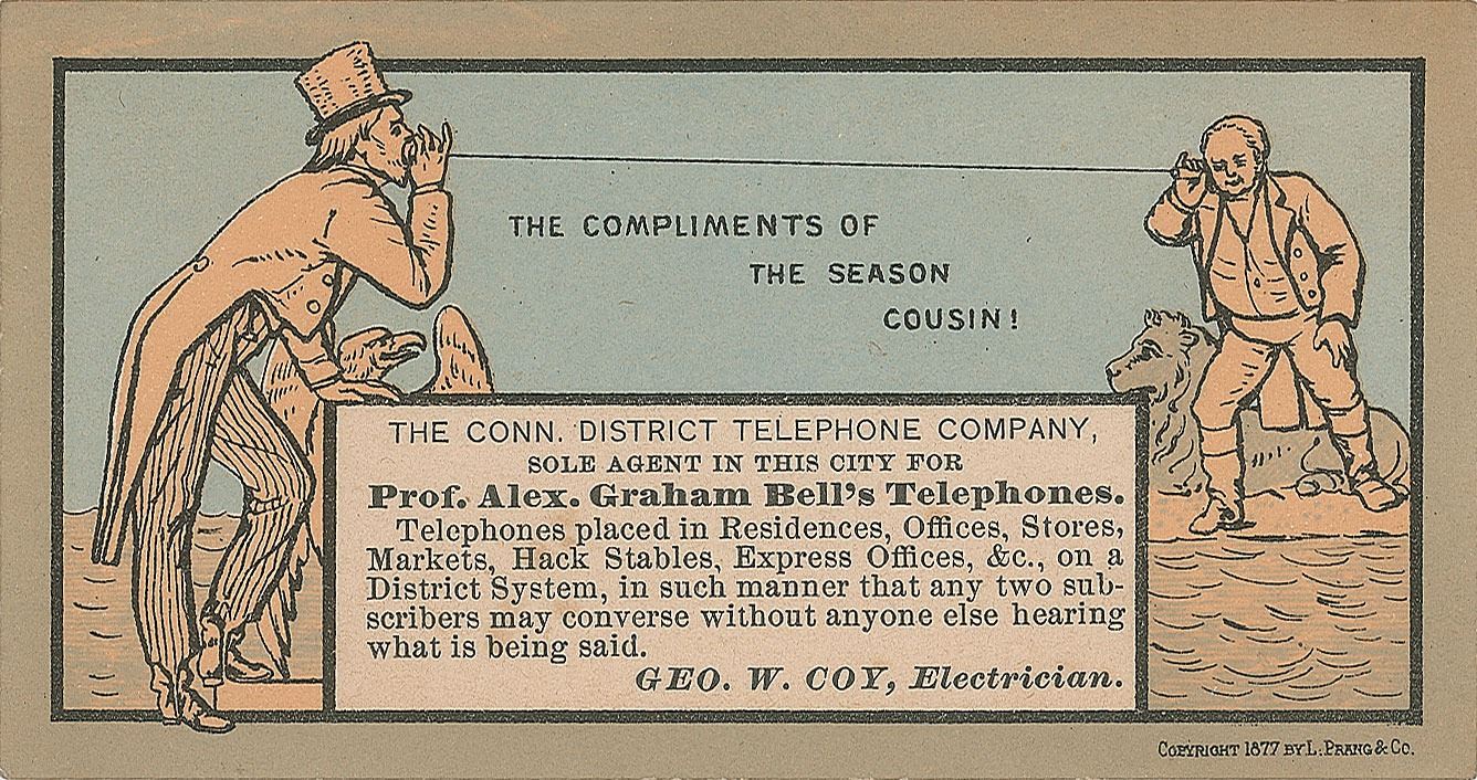 Original circa 1877 multicolored trade card for "Prof. Alex. Graham Bell's Telephones," 4.25 x 2.5, with color design depicting Uncle Sam having a transatlantic telephone conversation with John Bull. Copyrighted in 1877 by Louis Prang & Company, the card reads, "The Compliments of the Season Cousin!," with caption box below: "The Conn. District Telephone Company, Sole Agent in This City for Prof. Alex. Graham Bell's Telephones. Telephones placed in Residences, Offices, Stores, Markets, Hack Stables, Express Offices, etc, on a District System, in such manner that any two subscribers may converse without anyone else hearing what is being said. Geo. W. Coy, Electrician." In fine condition, with some foxing and toning on the reverse. Accompanied by a donor/exhibit card for the "Alexander K. McClellan Chapter No. 40 Telephone Pioneers of America."