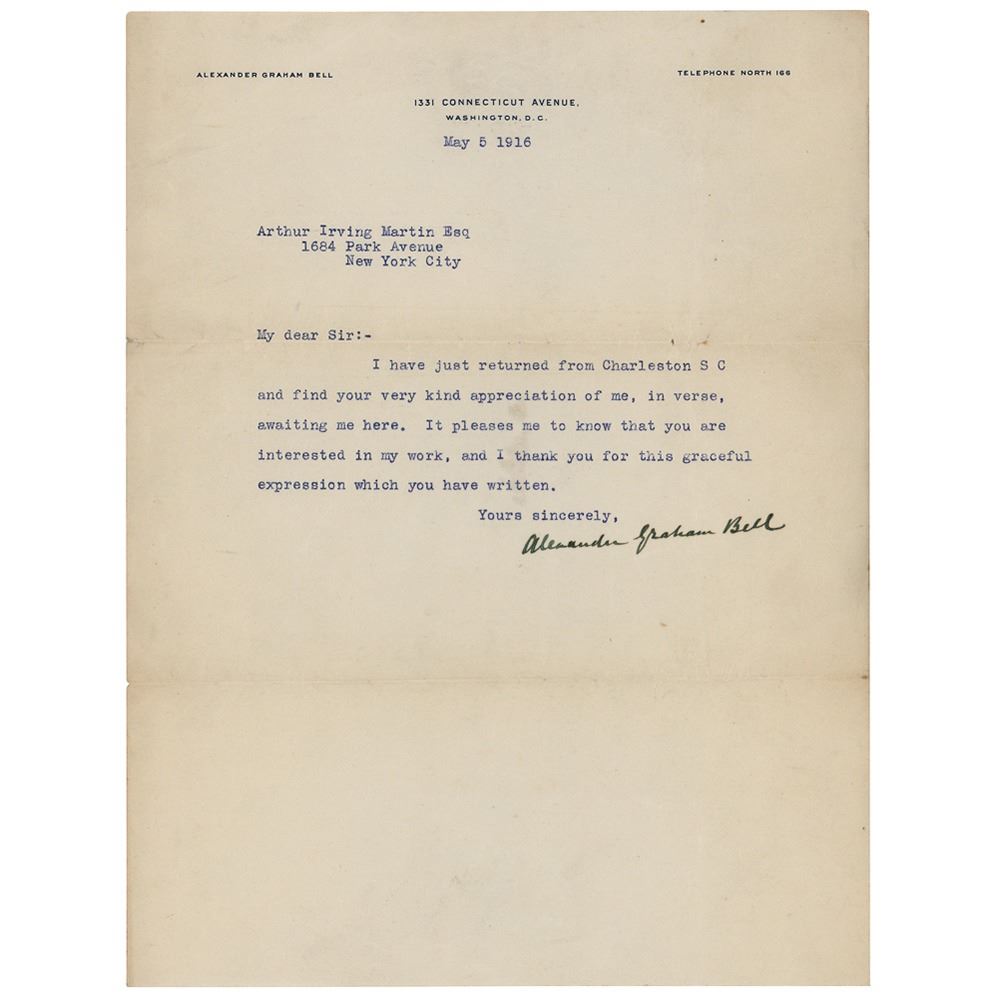 TLS, one page, 8.5 x 11, personal letterhead, May 5, 1916. Letter to Arthur Irving Martin, in full: "I have just returned from Charleston, S.C. and find your very kind appreciation of me, in verse, awaiting me here. It pleases me to know that you are interested in my work, and I thank you for this graceful expression which you have written." In fine condition, with scattered light creasing.