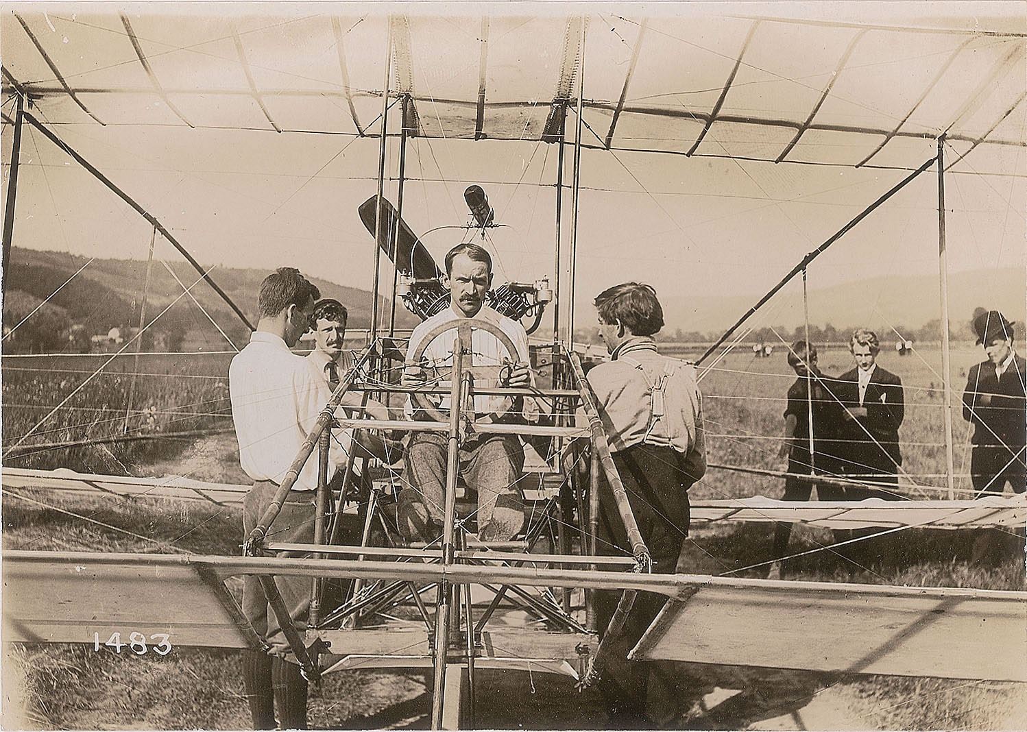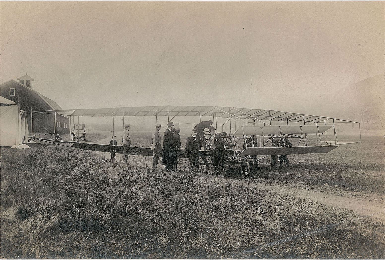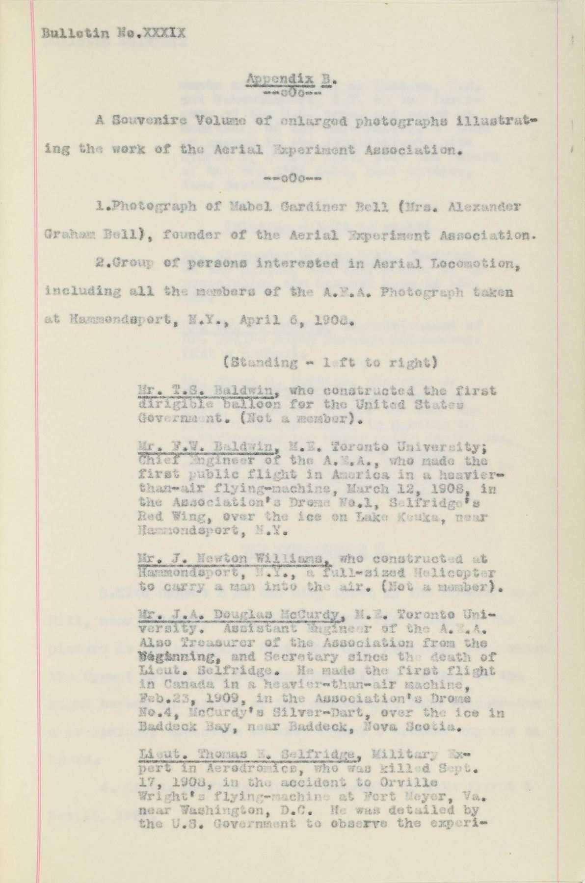 1. The members of the Aerial Experiment Association at a flying field at Rheims, near Hammondsport, NY, showing T. S. Baldwin, F. W. Baldwin, J. Newton Williams, J. A. Douglas McCurdy, Thomas Selfridge, Alexander Graham Bell, William F. Bedwin, and Glenn H. Curtiss