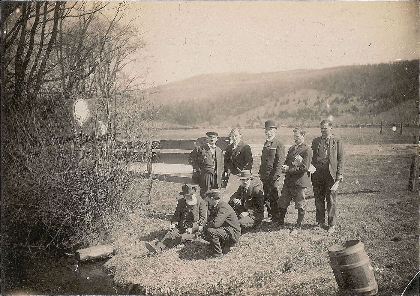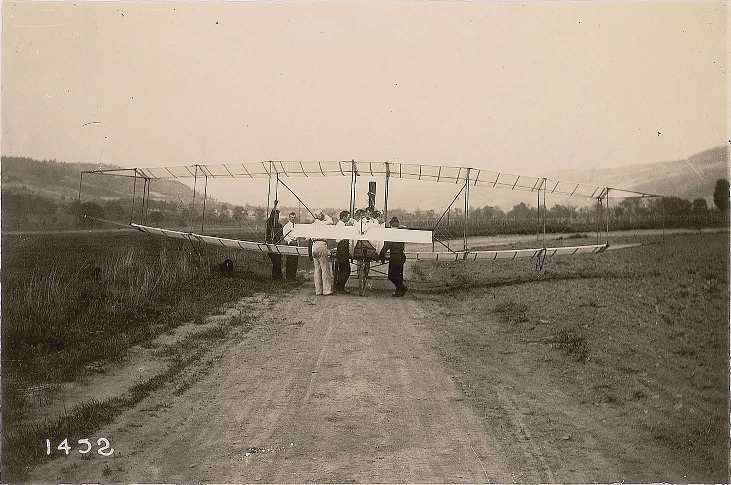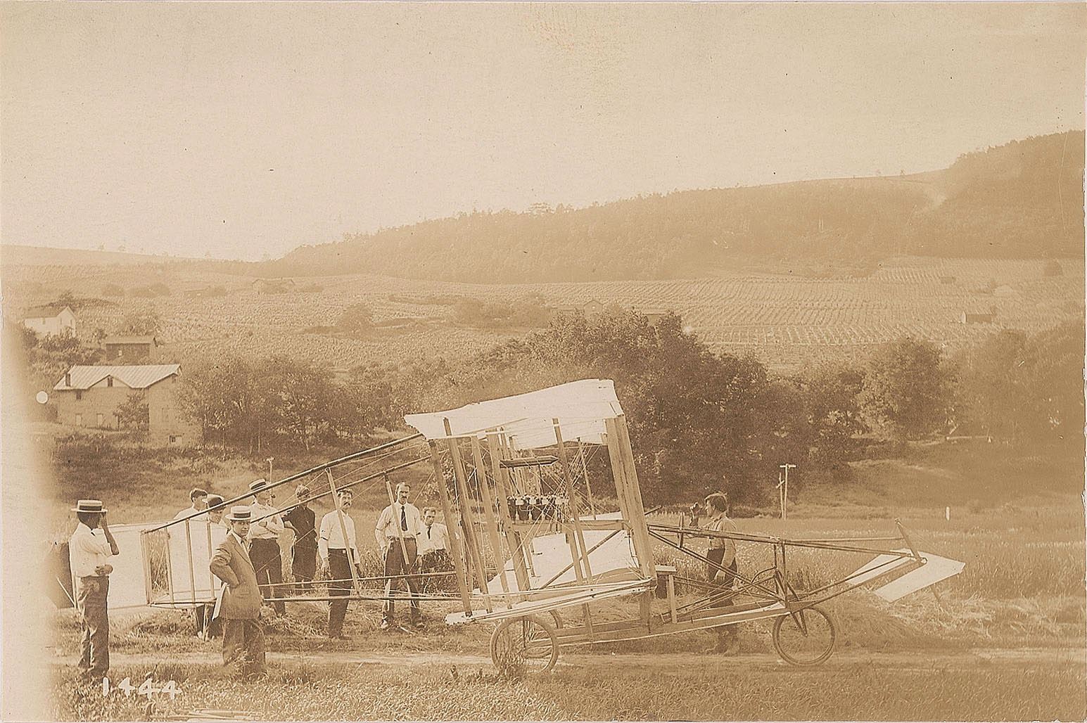 1. The members of the Aerial Experiment Association at a flying field at Rheims, near Hammondsport, NY, showing T. S. Baldwin, F. W. Baldwin, J. Newton Williams, J. A. Douglas McCurdy, Thomas Selfridge, Alexander Graham Bell, William F. Bedwin, and Glenn H. Curtiss