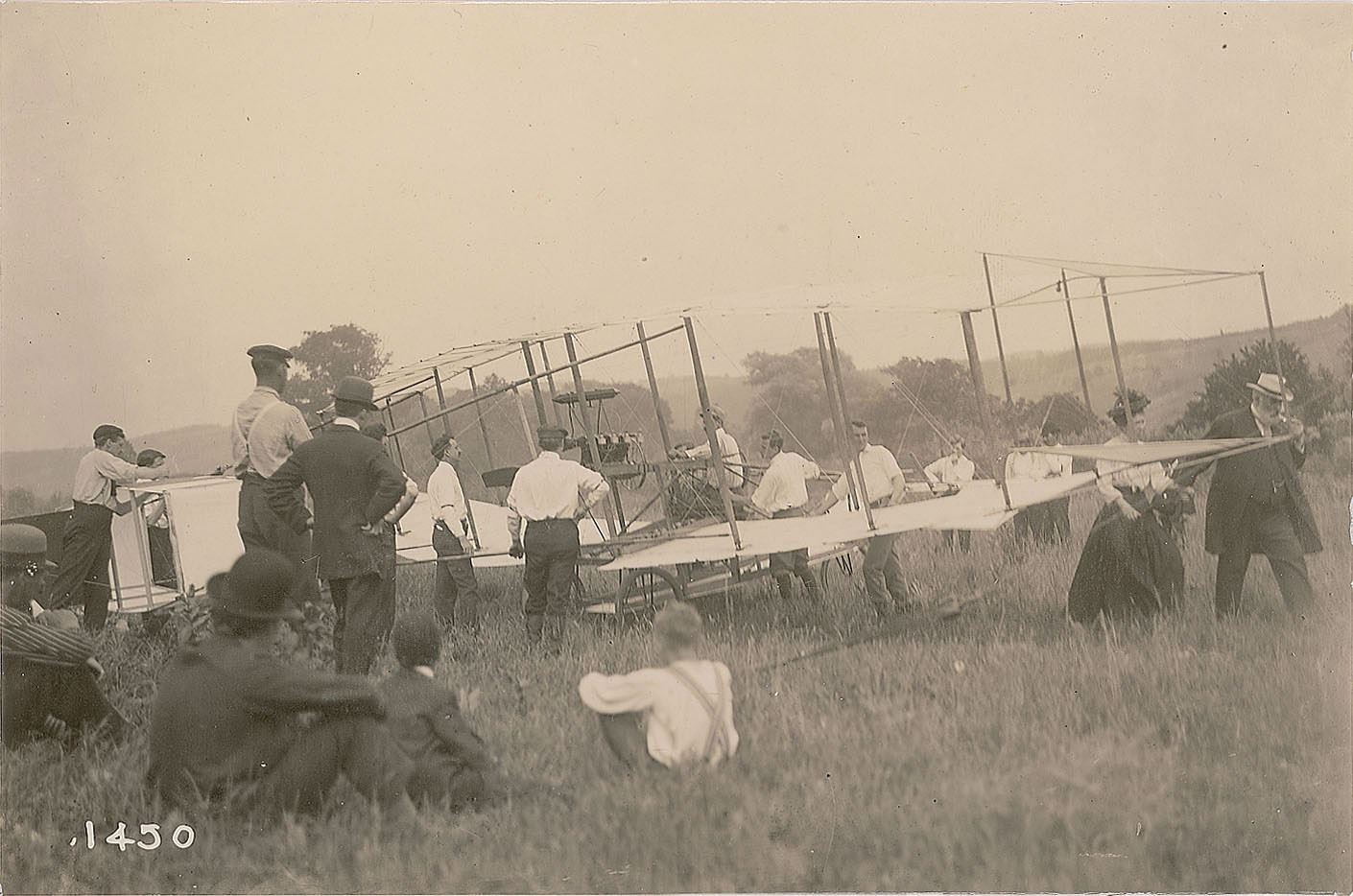 Significant collection of 25 vintage silver gelatin prints portraying Alexander Graham Bell and his fellow members of the Aerial Experiment Association (including Glenn Curtiss, Frederick Walker Baldwin, J. A. Douglas McCurdy, Thomas Selfridge, and others) along with their aerodrome aircraft, ranging in size from 3.75 x 3 to 6.5 x 4.75. After experimenting with tetrahedral kites since 1898, Alexander Graham Bell and his wife Mabel Gardiner Bell decided to form the Aerial Experiment Association (AEA). The AEA was officially founded at the Halifax Hotel in Nova Scotia on October 1, 1907, its purpose being to construct ‘a practical flying aerodrome or flying machine driven through the air by its own power and carrying a man.’ The experiments started near Bell’s home at Beinn Bhreagh, near Baddeck, Nova Scotia. In February 1908, the AEA moved to Hammondsport, New York, a village on the south end of Keuka Lake, one of the state’s so-called ‘Finger Lakes.’ Key members of the association individually contributed to the designs of the ‘aerodromes’—the most successful of which may have been Glenn H. Curtiss’s June Bug, which won the Scientific American Cup, the first aeronautical prize awarded in the United States, for making a public flight of over one kilometer on July 4, 1908.
