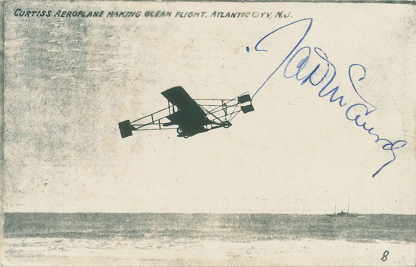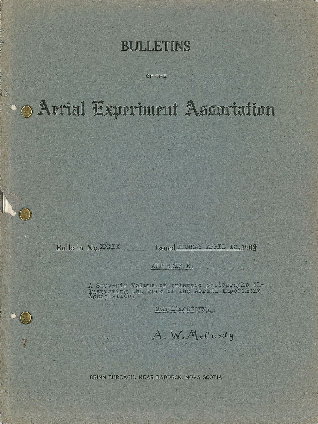 Also includes: two later cardstock photos signed in blue ink by J. A. Douglas McCurdy; as well as an extremely rare souvenir volume of 31 enlarged photographs illustrating the work of the Aerial Experiment Association, issued on April 12, 1909, marked “A. W. McCurdy” on the front. The paperback brad-bound volume has an eight-page typewritten appendix at the front. When the AEA was disbanded in 1909, this souvenir volume was offered to all the surviving members: Mabel Gardiner Bell, Alexander Graham Bell, Glenn Curtiss, J. A. Douglas McCurdy, and F. W. Baldwin—it is likely that only four or five volumes were ever published. In addition to the AEA's aerodromes, the volume notably depicts and discusses Alexander Graham Bell's "Kite Cygnet I" and "Cygnet II," which had extremely unorthodox designs using tetrahedral cells as wings—Graham Bell first tested the design as a kite, and then built a powered version as the AEA's 'Drome No. 5.' In overall fine condition. Provenance: Thomas G. Foxworth Aeronautical Collection.