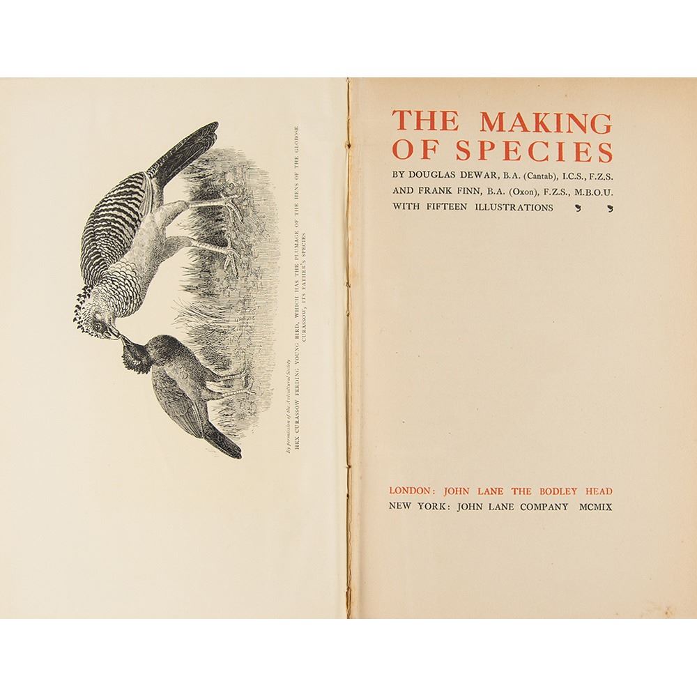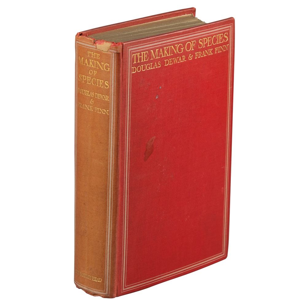 Rare book from the personal library of Alexander Graham Bell: The Making of Species by Douglas Dewar and Frank Finn. London: John Lane, 1909. Hardcover, 6.25 x 9, 400 pages. Stamped on the first free end page with Alexander Graham Bell's ownership stamp, featuring his facsimile signature: "Library of Alexander Graham Bell." Also bears the bookplate of Bell's son-in-law, Gilbert Hovey Grosvenor, affixed to the front pastedown. It is a significant scientific work, offering a discussion of Charles Darwin's theory of natural selection, objections to the theory, the means by which traits are inherited, and factors of evolution. Numerous interesting passages throughout have been marked in pencil. Book condition: VG/None, with sunning to spine, a stain to the front board, and wear to the head of the spine.