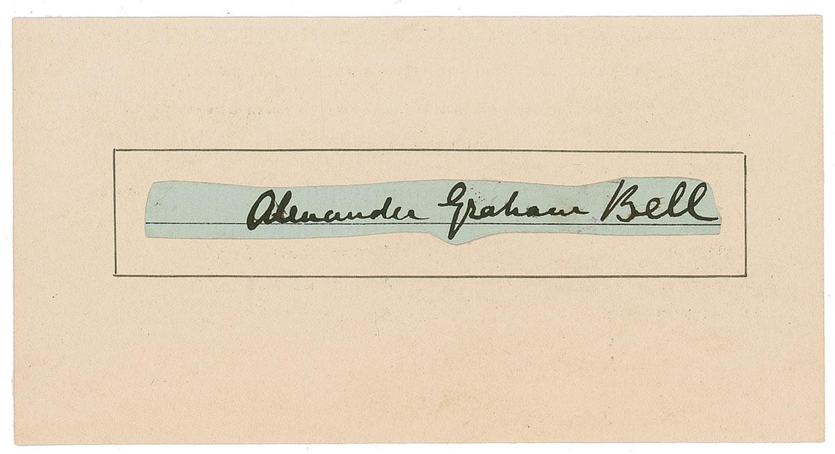 Bold ink signature, “Alexander Graham Bell,” on a light green irregularly clipped slip, most likely from a check, and affixed to a 5 x 2.75 off-white card. In fine condition, with a few trivial spots and light toning.