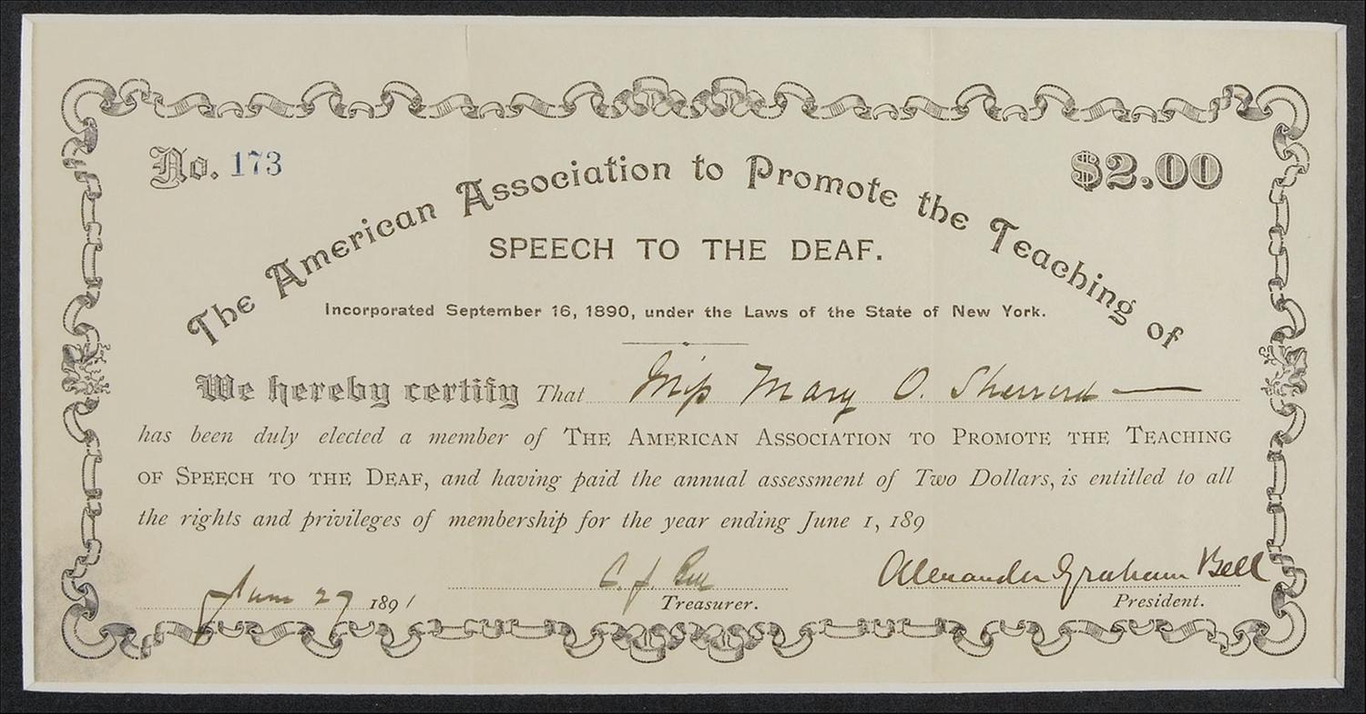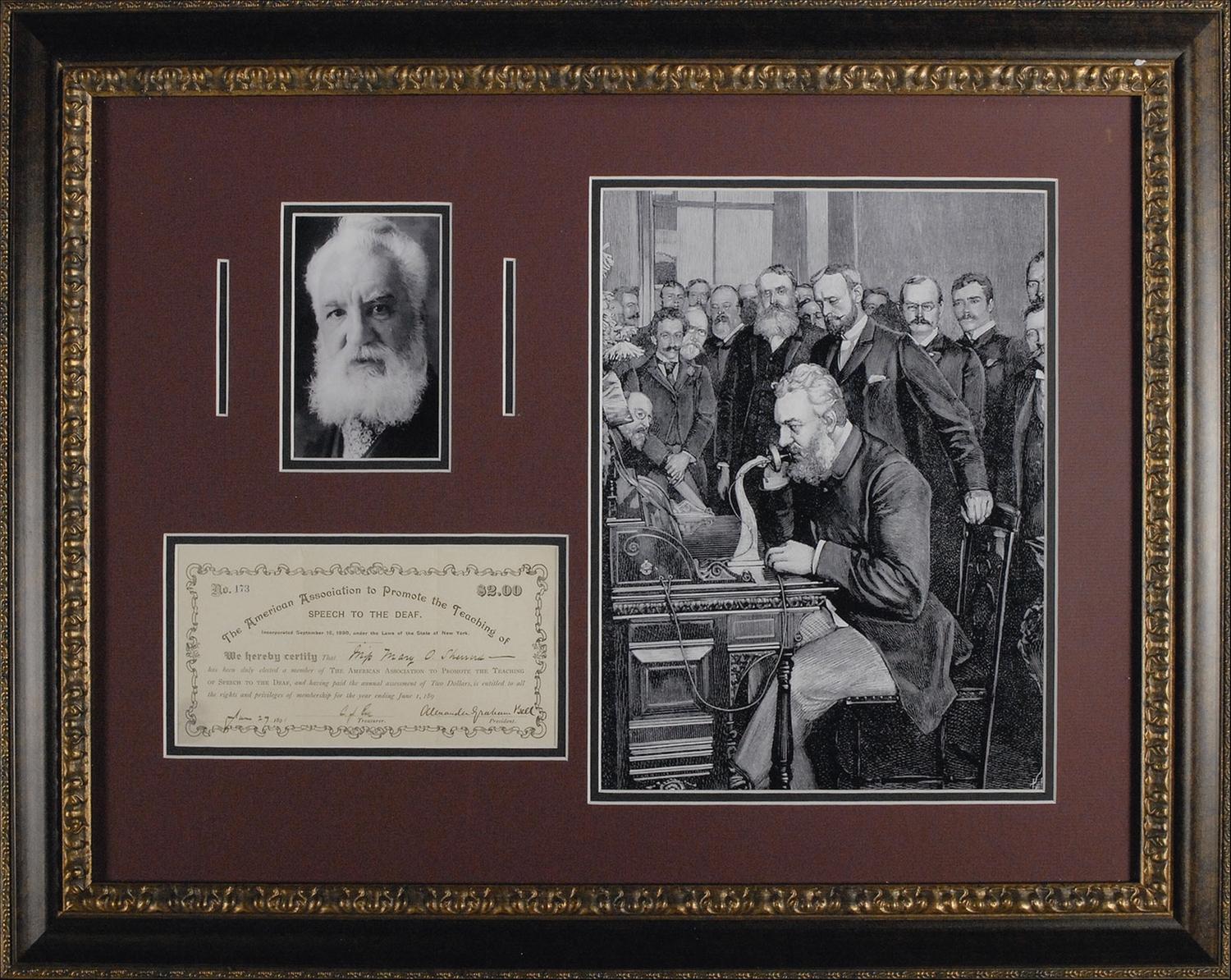 Scottish-born scientist and inventor (1847–1922) who conceived the telephone, founded the Bell Telephone Company, and invented various devices for aiding the deaf. Partly-printed DS, one page, 9 x 4.5, June 29, 1891. Certificate from the American Association to Promote the Teaching of Speech to the Deaf presented to Miss Mary O. Sherman having “been duly elected a member of The American Association to Promote the Teaching of Speech to the Deaf, and having paid the annual assessment of Two Dollars, is entitled to all the rights and privileges of membership.” Signed at the bottom in black ink, “Alexander Graham Bell,” as president of the association. Double matted and framed with a portrait of Bell, and a larger image of an artist’s rendition of Bell’s first telephone call, to an overall size of 29 x 22. In fine condition, with two vertical folds, one through a single letter of signature.