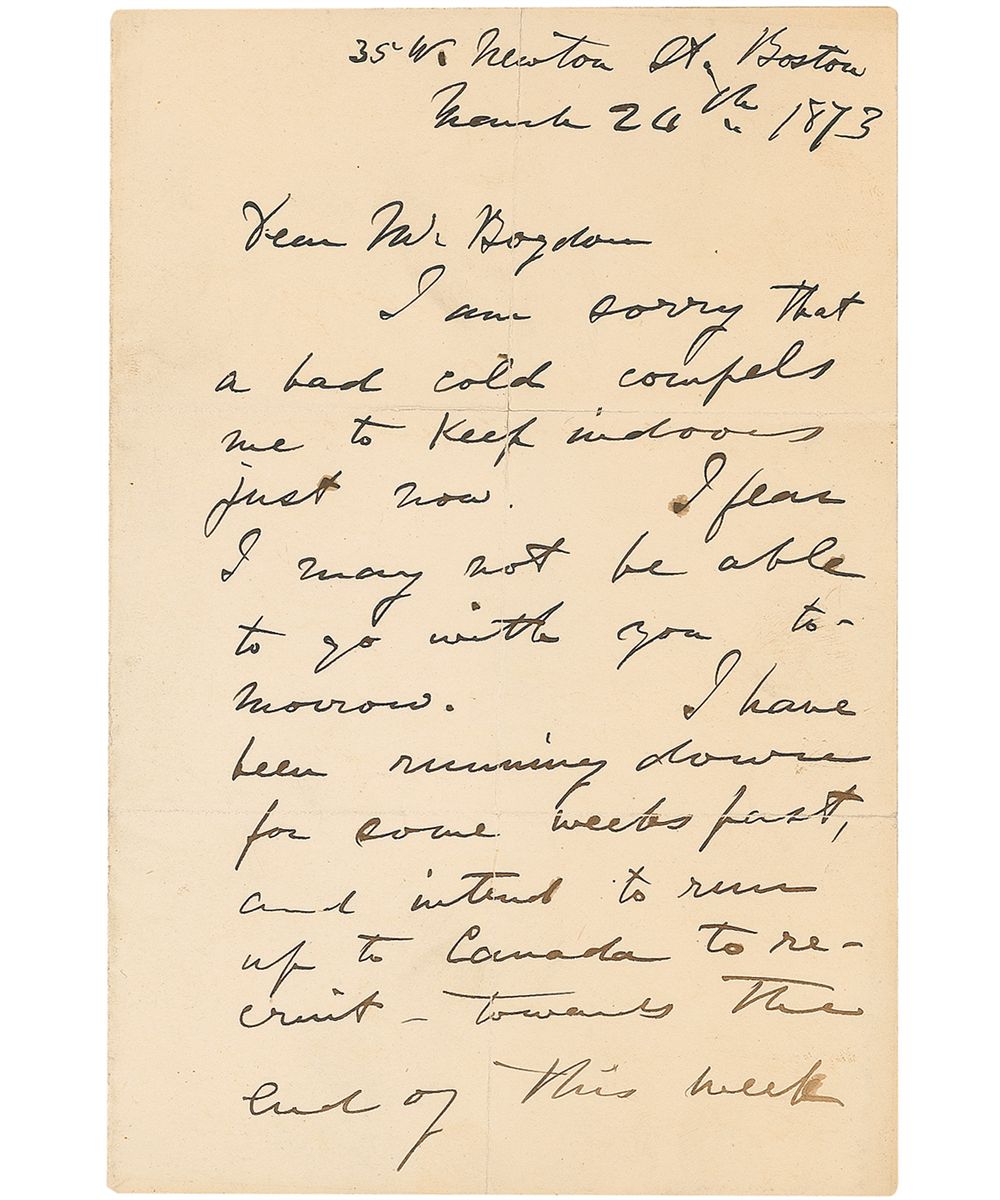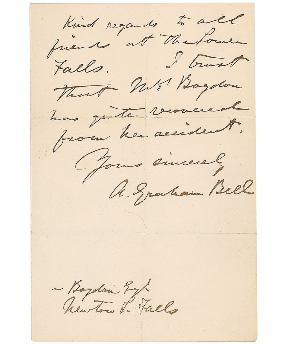 ALS signed “A. Graham Bell,” two pages, 4.5 x 7, March 24, 1873. Letter to Mr. Bogdon. In part: “I am sorry that a bad cold compels me to keep indoors just now. I fear I may not be able to go with you tomorrow. I have been running down for some weeks past, and intend to run up to Canada to recruit towards the end of this week. Kind regards to all friends at Lower Falls.” A few small separations along intersecting folds, one fold through a single letter of signature, a few wrinkles, and mild toning to first page, otherwise fine condition. At the time of this letter Bell was Professor of Vocal Physiology and Elocution at the Boston University School of Oratory. After spending the summer of 1873 at the family home in Canada, he returned to Boston and decided to concentrate on his experiments in sound which eventually led to his first successful transmission via telephone three years later in 1876.