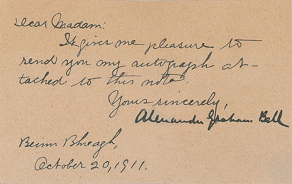 Brief LS, one page, 4 x 2.5, Beinn Breagh, October 20, 1911. Brief letter to a collector. In full: “It gives me pleasure to send you my autograph attached to this note.” In fine condition, with a uniform shade of mild toning, a few light bends, and mounti