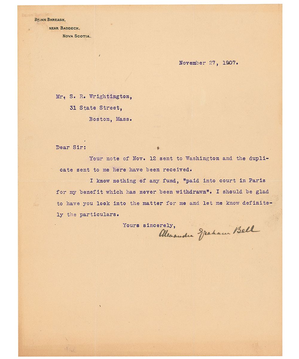 TLS, one page, 7.75 x 10.5, Beinn Bhreagh letterhead, November 27, 1907. Letter to S. R. Wrightington of Boston. In full: “Your note of Nov. 12 sent to Washington and the duplicate sent to me here have been received. I know nothing of any fund, ‘paid into court in Paris for my benefit which has never been withdrawn.’ I should be glad to have you look into the matter for me and let me know definitely the particulars.” Intersecting folds (one vertical fold passing through the last letter of his first name) and mild haloing to signature, otherwise fine condition. Accompanied by the original mailing envelope and duplicate note referenced in the letter, in which Wrightington informs Bell that he may have unclaimed money in a French account.