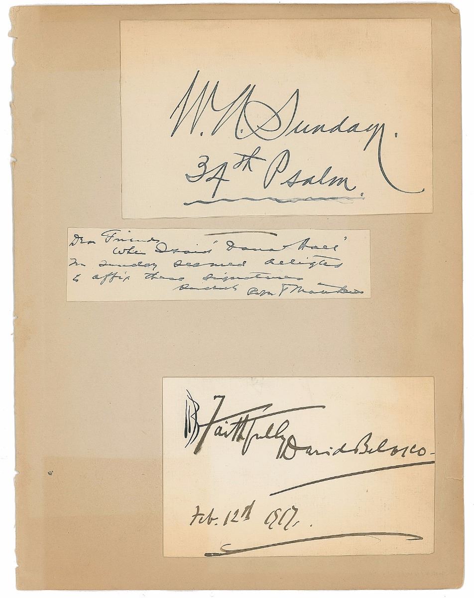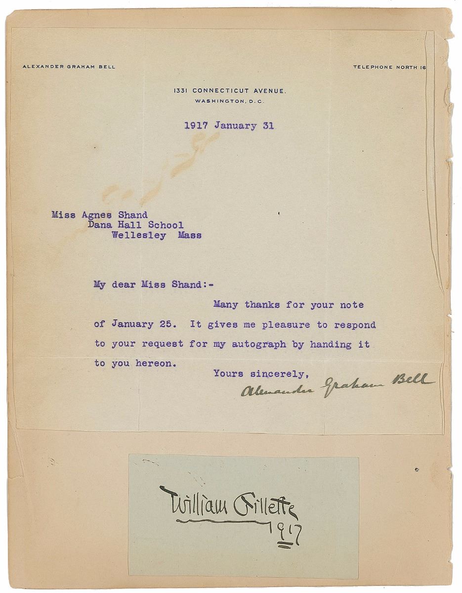 TLS, one page, 7 x 6.75, personal letterhead, January 31, 1917. Letter to Miss Agnes Shand of the Dana Hall School. In part: “It gives me pleasure to respond to your request for my autograph by handing it to you hereon.” Affixed to a larger off-white scrapbook page, which also bears an affixed signature of actor William Gillette below and affixed signatures of preacher Billy Sunday, David Belasco, and one other on the reverse. Intersecting folds, crease to one edge, trimmed edges, and some light ink marks near the top of the page, otherwise fine condition.