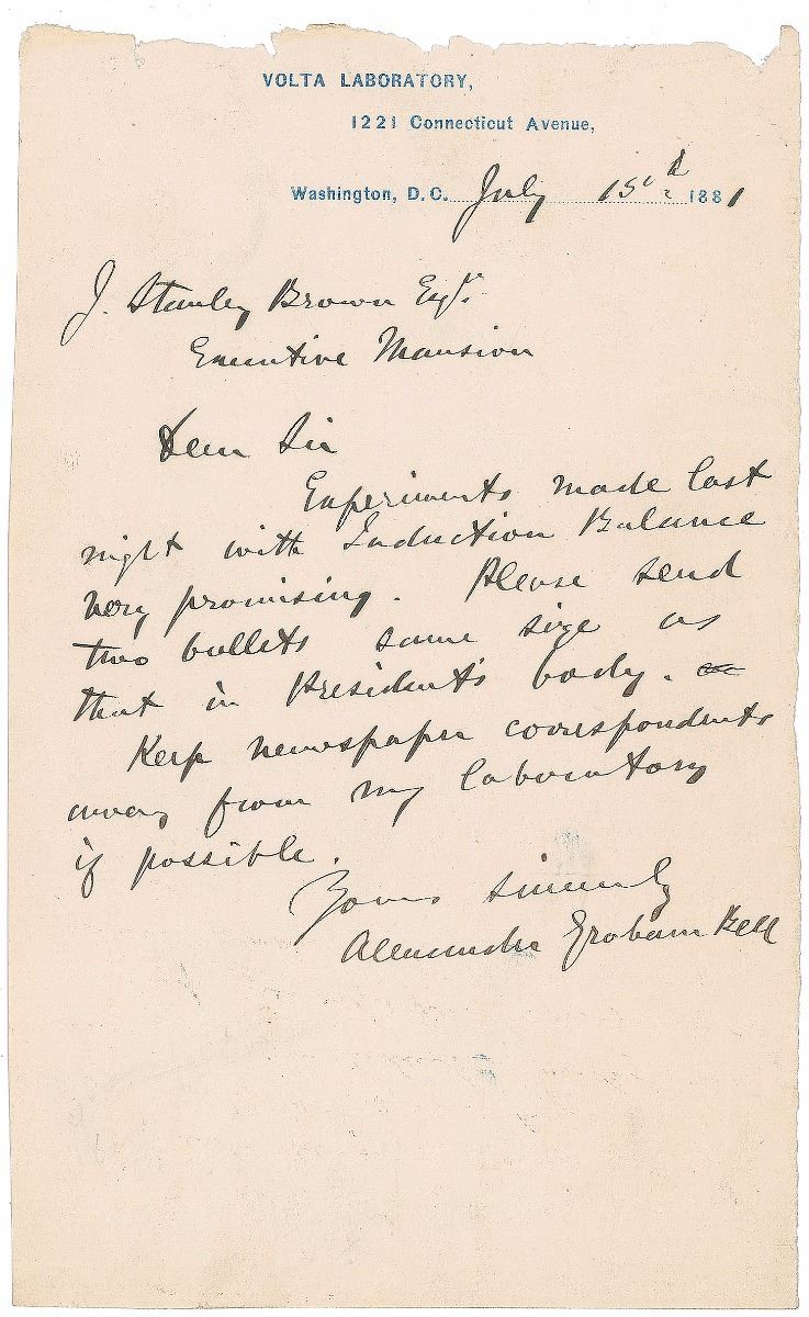 Remarkable ALS, one page, 4.75 x 8, Volta Laboratory letterhead, July 15, 1881. Addressed to the Executive Mansion, a letter to J. Stanley Brown, the private secretary to President Garfield, in full: "Experiments made last night with Induction Balance very promising. Please send two bullets same size as that in President's body. Keep newspaper correspondents away from my laboratory if possible." In fine condition, with a trimmed bottom edge and torn upper edge.