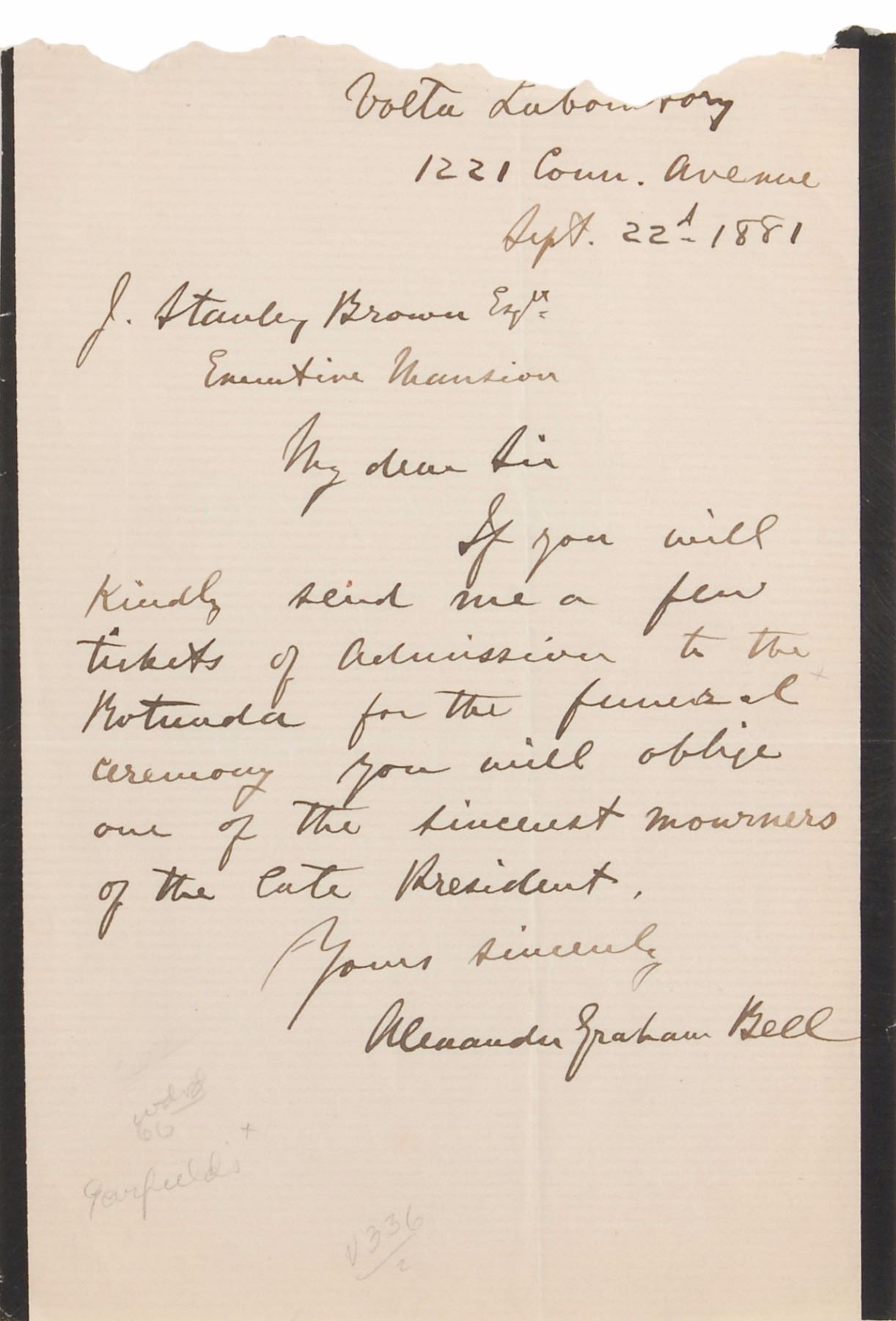 Exceptional ALS, one page, 5.25 x 7.5, black-bordered letterhead, September 22, 1881. Addressed to the Executive Mansion, a letter to J. Stanley Brown, the private secretary to President Garfield. In full: "If you will kindly send me a few tickets of admission to the Rotunda for the funeral ceremony you will oblige one of the sincerest mourners of the late President." In fine condition, with a trimmed bottom edge and torn upper edge. In mid-July of 1881, Bell was invited to the White House to locate the bullet fired into the back of President Garfield by assassin Charles Guiteau. In an attempt to achieve what the nation's best surgeons could not, Bell searched for the bullet with an induction balance device, an early version of the metal detector inspired by the work of Gustave Trouve. Bell made efforts on July 26 and August 1, but was ultimately unable to locate the stray bullet; it was later determined that the metal bedsprings below the supine president had skewed the experiment. President Garfield died from his wounds just three days before this letter was written. With such a close association to the tragic fate of America's twentieth president, this is a superb and solemn letter from one of the Industrial Age's foremost names.