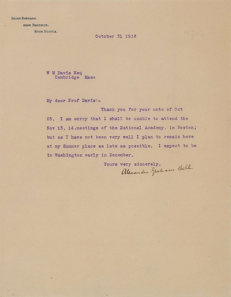 TLS, one page, 8.5 x 11, Beinn Bhreagh letterhead, October 31, 1916. Letter to noted geographer William Morris Davis, in part: "I am sorry that I shall be unable to attend the Nov 13, 14, meetings of the National Academy, in Boston; but as I have not been very well I plan to remain here at my Summer place as late as possible. I expect to be in Washington early in December." Removably encapsulated in a mylar sleeve. In fine condition. Both Morris and Bell were members of the National Academy of Sciences.