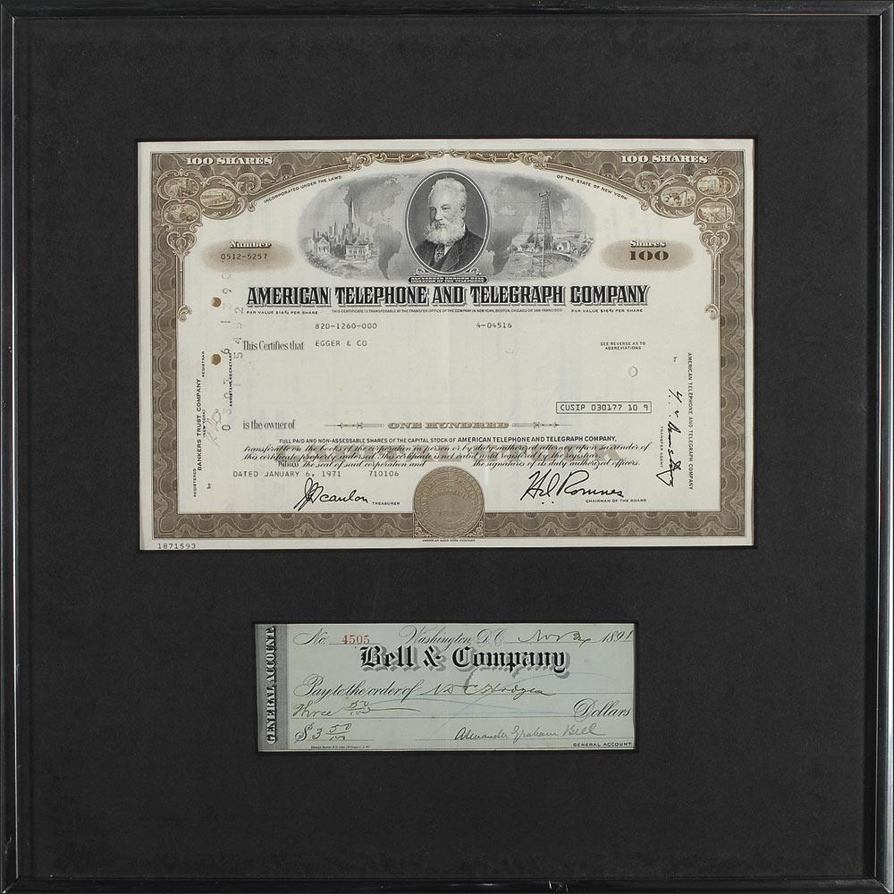 Bell & Company business check, 7.5 x 2.5, filled out in another hand and signed by Bell, payable to Mr. C. H. Hodges for $3.50, November 24, 1891. Matted and framed with an American Telephone and Telegraph Company stock certificate for 100 shares issued to Egger and Co., to an overall size of 17.25 x 17.25. In fine condition, with small tear to body and blue cancellation marks to check, none affecting the clean signature area. Pre-certified PSA/DNA and RRAuction COA.