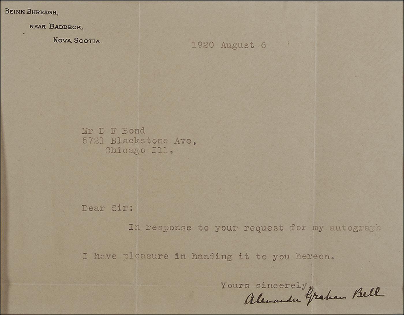 TLS, one page, 7 x 5.5, Beinn Bhreagh letterhead, August 6, 1920. Short letter to a collector. In full: “In response to your request for my autograph I have pleasure in handing it to you hereon.” Boldly signed at the conclusion by Bell. Double cloth matted and framed with the original mailing envelope and a portrait of Bell, to an overall size of 22 x 16. Intersecting folds, one through a single letter of signature, a uniform shade of mild toning, otherwise fine condition. Envelope’s stamp has also been removed. Pre-certified PSA/DNA and RRAuction COA.